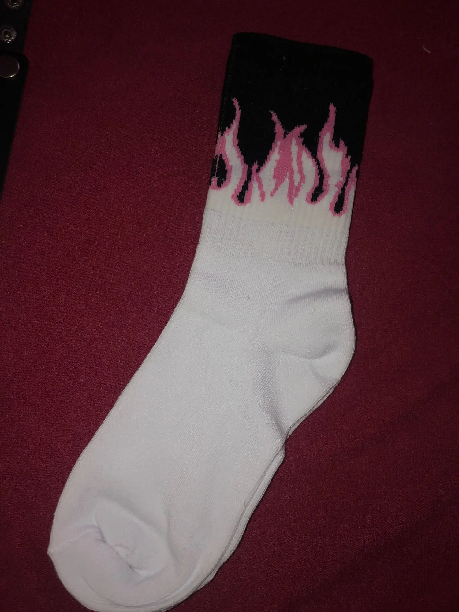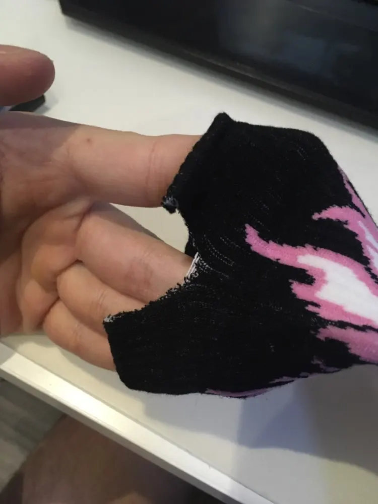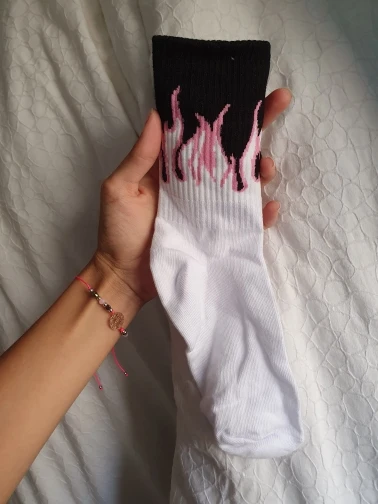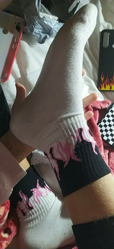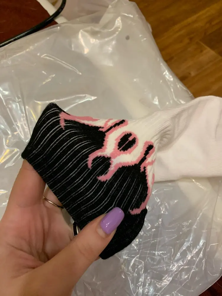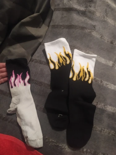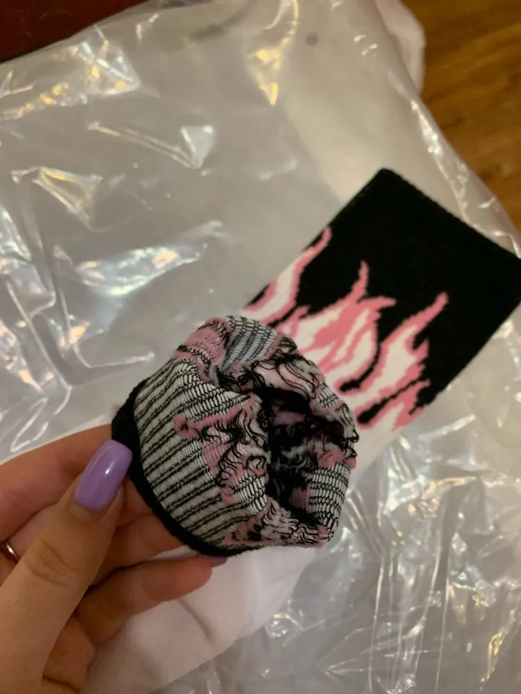 Я получил эти довольно быстро, я думаю, что в течение месяца это не то, что я ожидал при заказе на этом сайте. Носки приятные на ощупь, материал приятный, но принт может быть лучше. Эти носки делают то, что там, где есть белые линии, когда они растягиваются, как показано на моей фотографии. Это не так плохо, только в черной части носка.