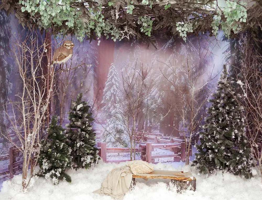 Фон для детской фотосъемки с изображением рождественской деревни снега Совы совы