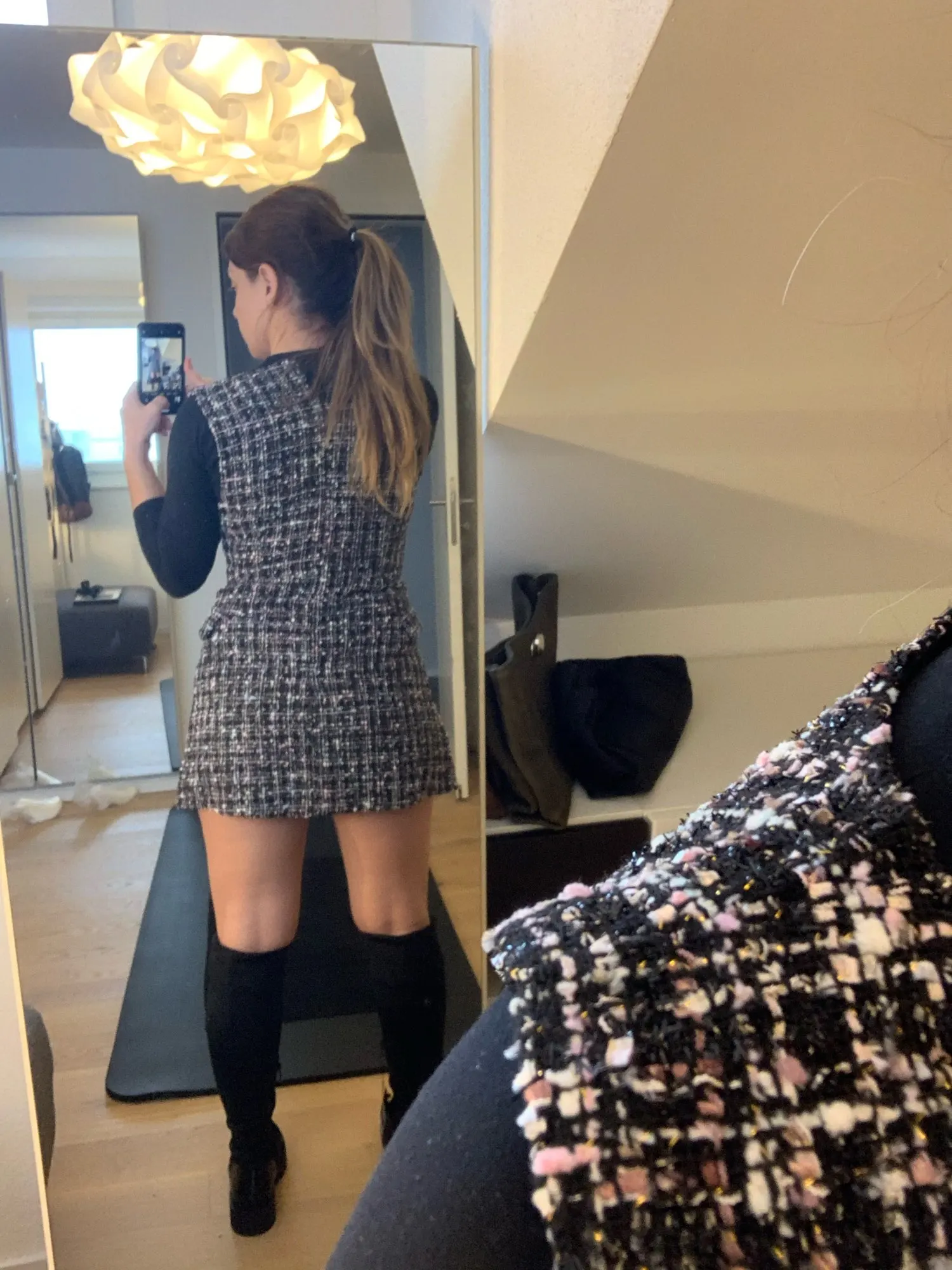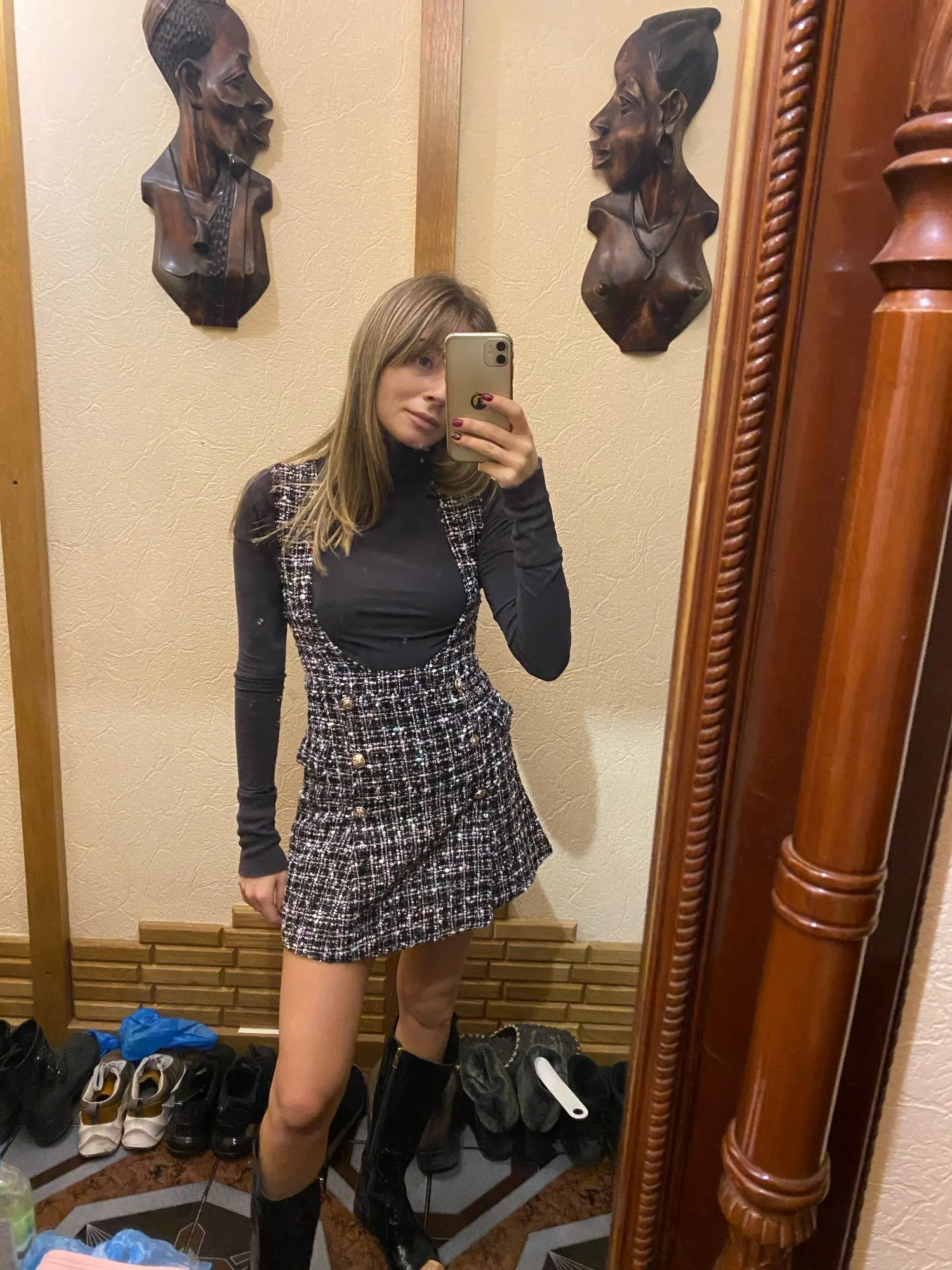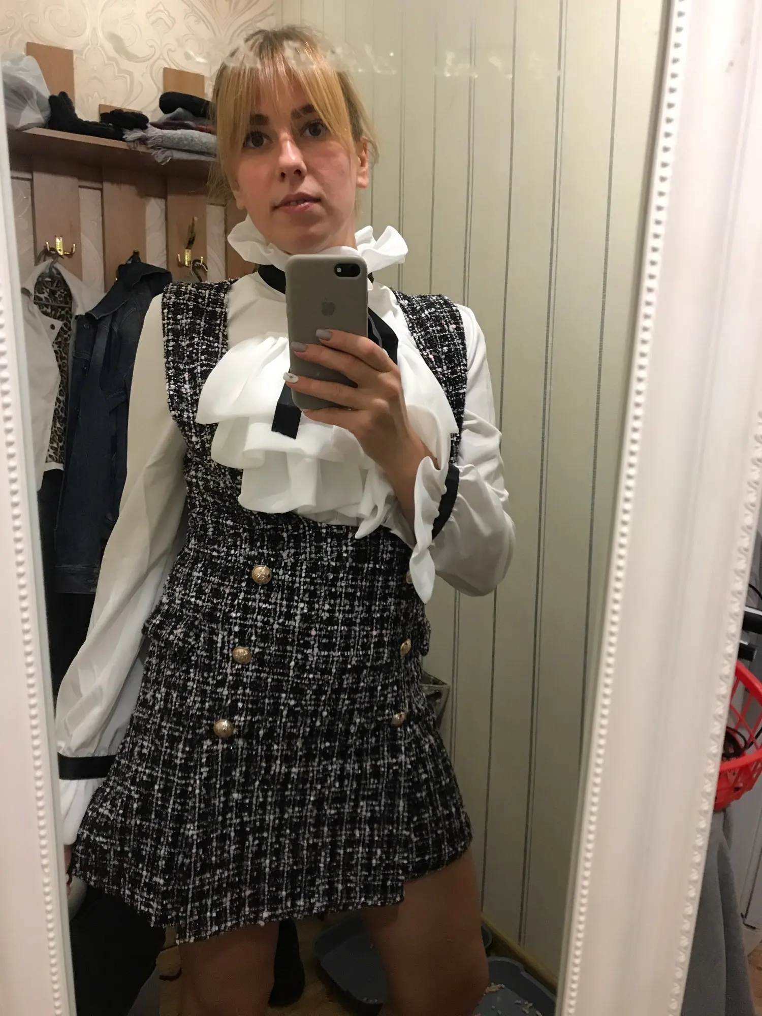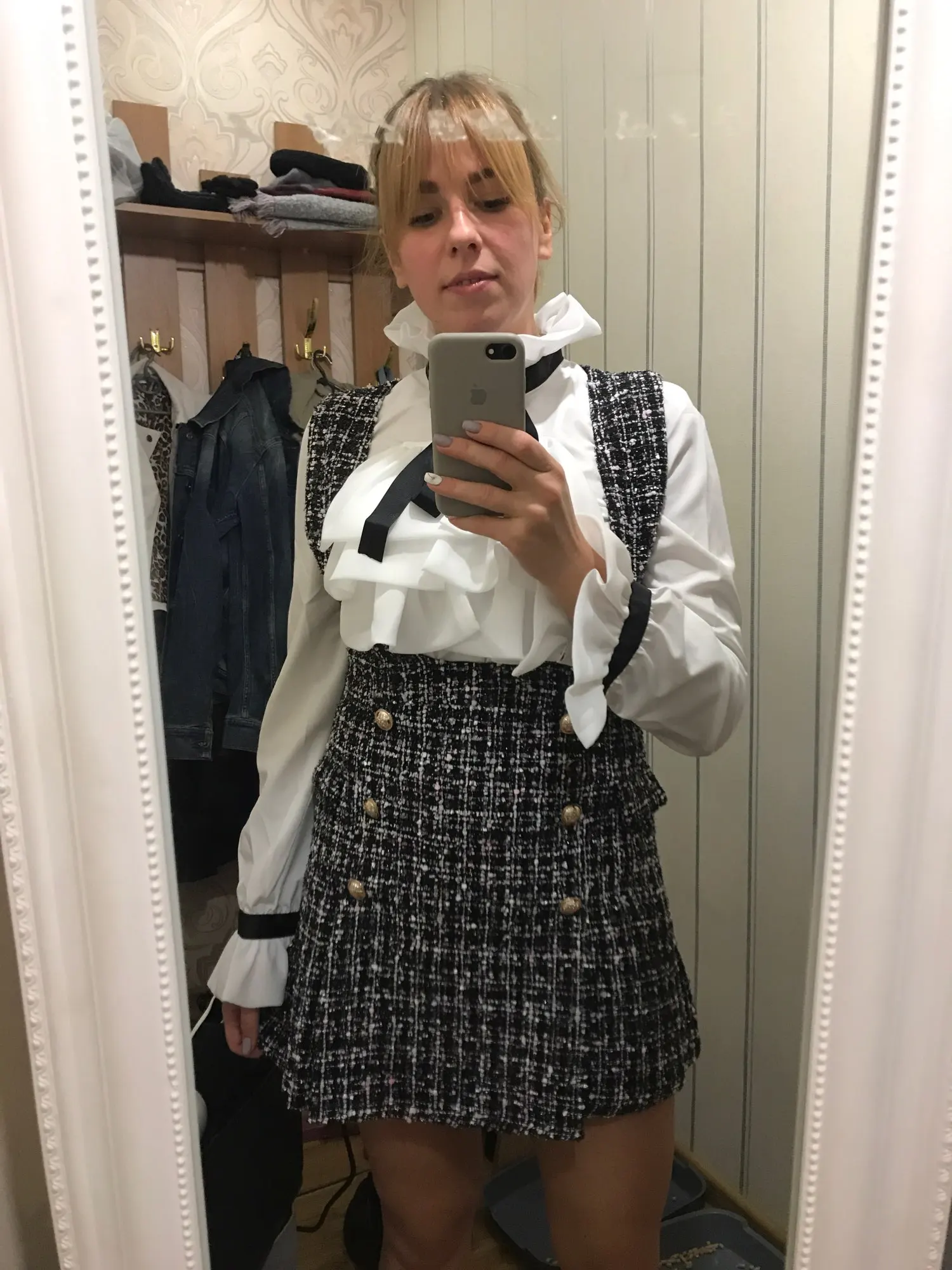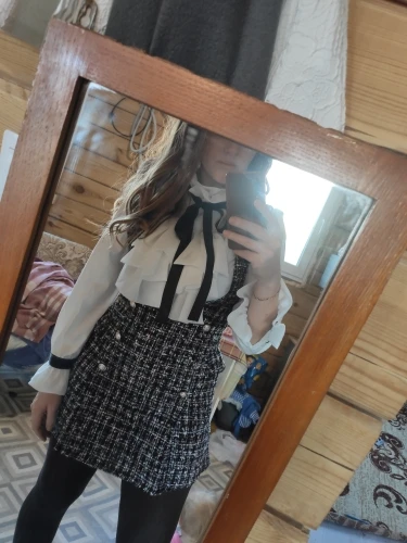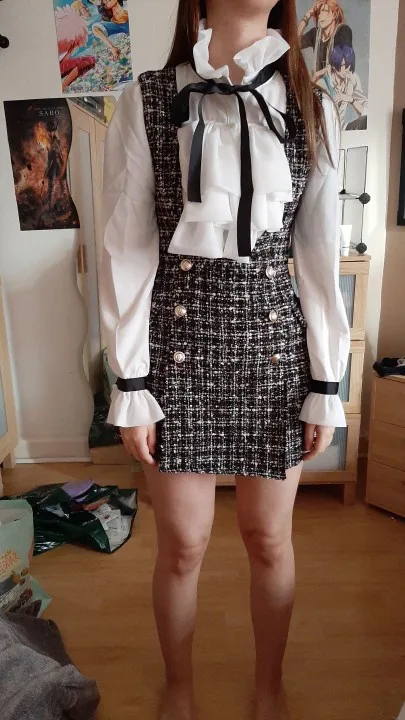 Шикарное платье. Блузка также топ. Размер M 175 см и 68 кг хорошо сидит... Vllt немного короткий, но с толстыми колготками выглядит довольно красиво. Спасибо!