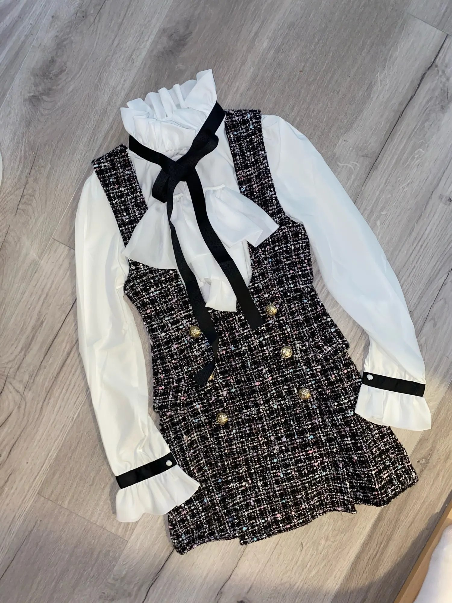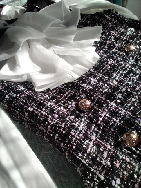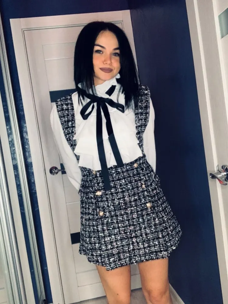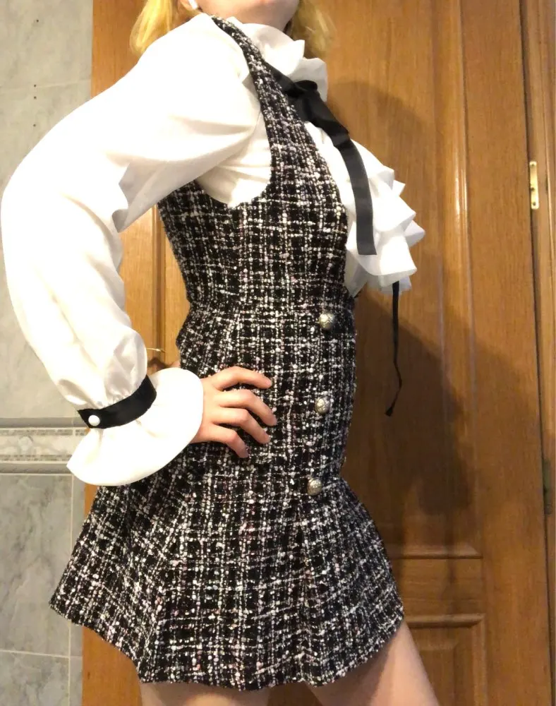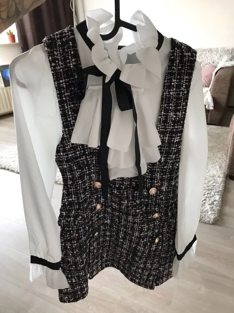 Женский комплект из 2 предметов, элегантный шифоновый топ с оборками и бантом и двубортное клетчатое твидовое платье-жилет, Осень-зима 2021