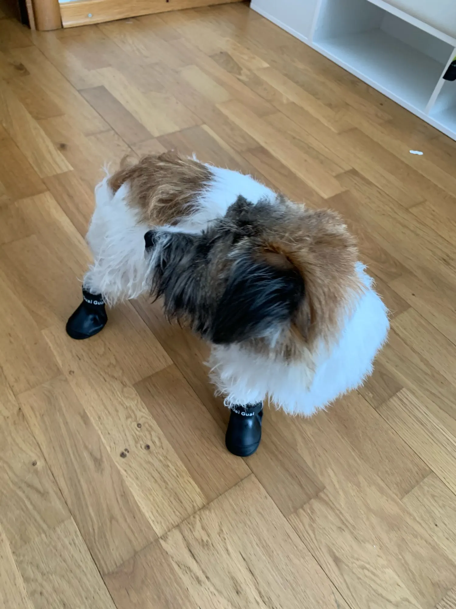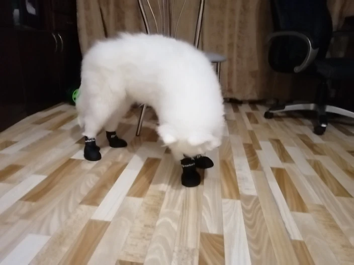 А сапожки маловаты, главное с задних лап не сваливаются,а спередних тут же свалились.