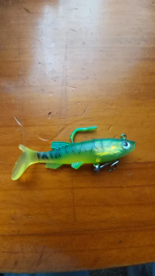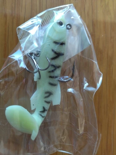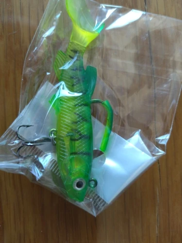 Получил быстро и это хорошо. Рыбка маленькая, скорее всего на окуня. Верхний крючок выше тела приманки на 5 мм, наврядли он зацепит рыбу. Нижний крючок явно не щучий, маленький, наверное менять надо его.