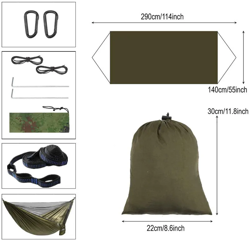 Посылка: посылка включает в себя один портативный гамак для кемпинга, два веревки (5 + 1 кольцо), два гамака карабина, два гвоздя, один упаковочный пакет