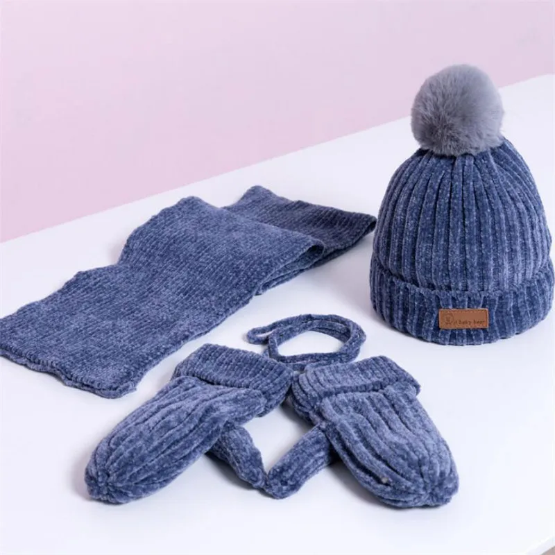 Детская зимняя теплая шапка и шарф, перчатки, Детская вязаная плюшевая шапка, наборы из 3 предметов, шапка с помпоном, шарфы, костюм, однотонная женская шапка