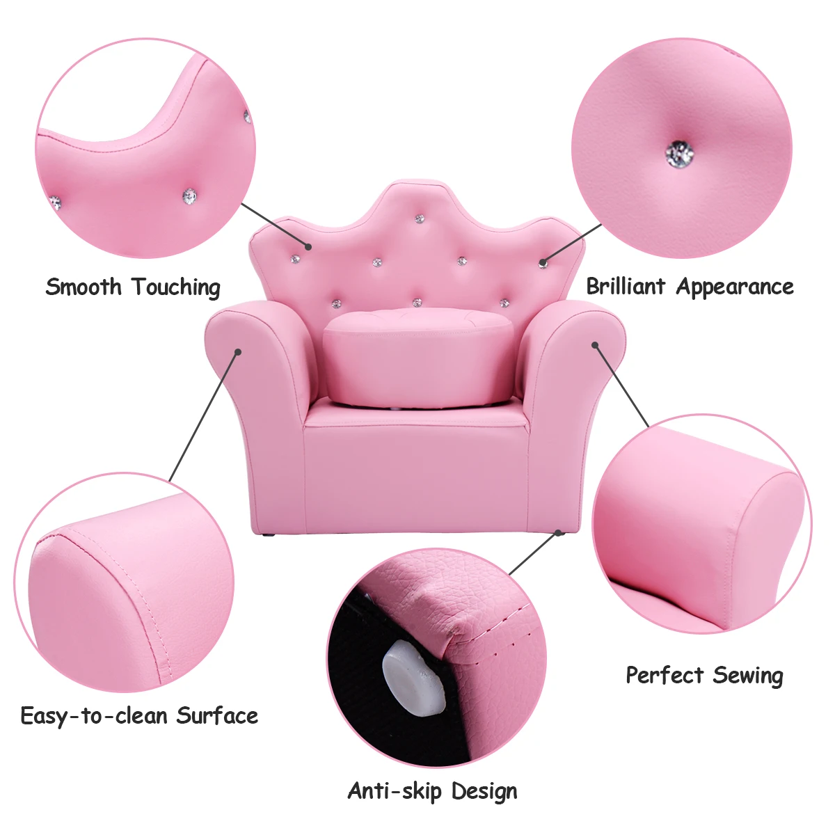 Этот милый и привлекательный детский диван с алмазным декором станет отличным дополнением для детской комнаты.Каждой маленькой девочке нужен ее собственный трон принцессы. Этот детский подлокотник на диване сделан специально для ваших маленьких, чтобы обеспечить очаровательное и удобное место для них, чтобы смотреть фильмы, играть в игры и читать книги. Рама из цельного дерева обеспечивает отличную стабильность и долговечность, а подкладка из губки высокой плотности обеспечивает более комфортное ощущение. Более того, корона в форме бриллиантов, несомненно, понравится детям. Этот красивый диван-идеальный подарок для ваших детей. И он может быть помещен в детскую спальню, гостиную, балкон, задний двор, как они хотят.