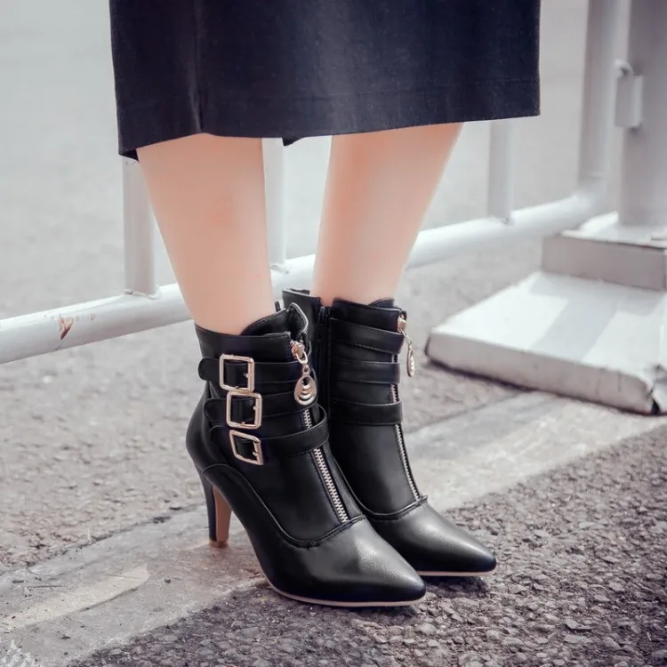 Ботинки женские на высоком каблуке, полусапожки с острым носком, на молнии, с пряжкой, белые, большие размеры 24, весна