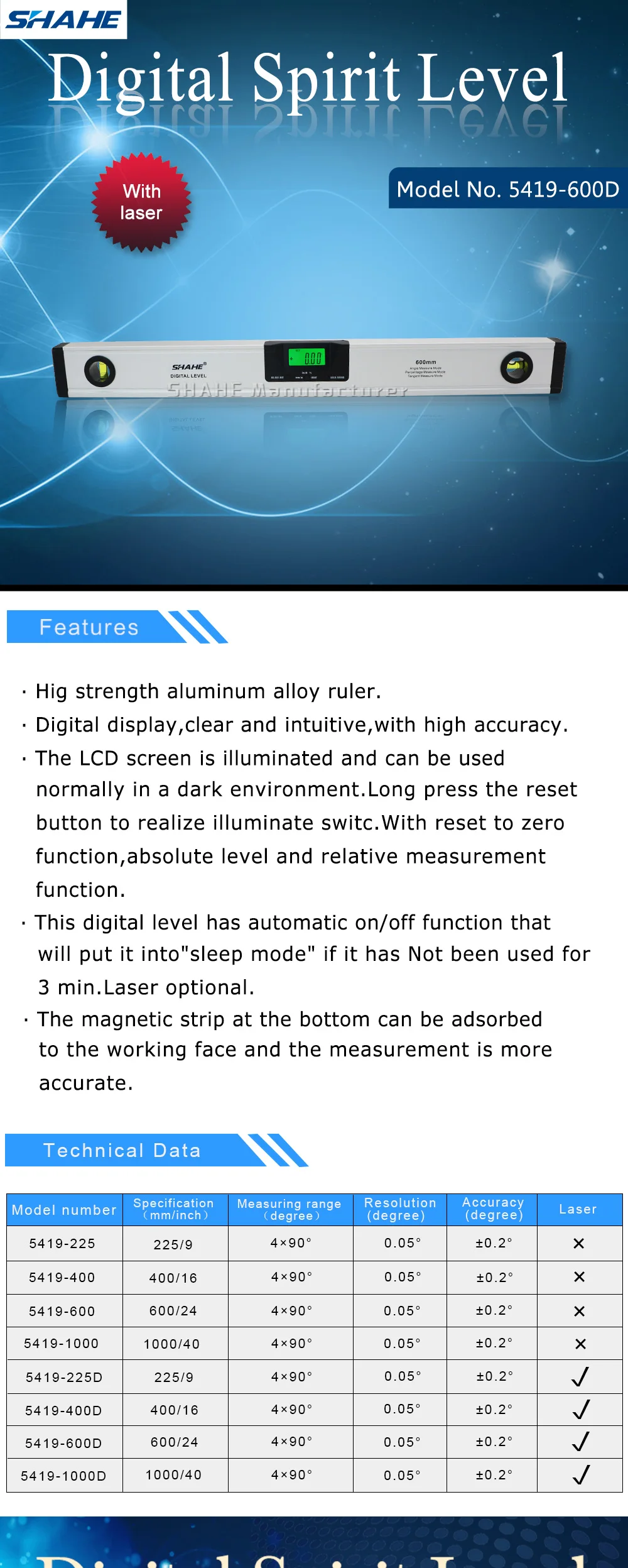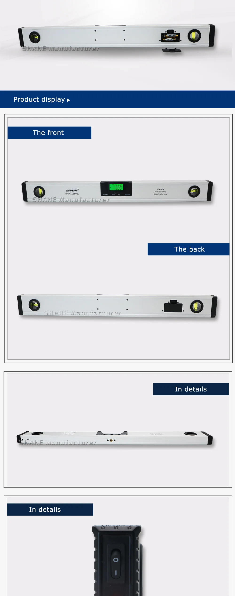 1. Высокая прочностьЛинейка из алюминиевого сплава.2. Цифровой дисплей, четкий и интуитивно понятный, с высокой точностью.3. ЖК-экран подсвечивается и может использоваться в обычном режиме в темноте. Нажмите и удерживайте кнопку сброса, чтобы включить переключатель.4. Цифровой уровень будетАвтоматическое отключение через 3 минуты.5.С лазерным излучателем, Он может делать горизонтальную коррекцию и разметку.6. ЕстьМагниты на дне.7. В наличии есть две версии, с лазером или без лазера, есть две версии, с магнитами или без магнитов пожалуйста, закажите тот, который вам нужен перед покупкой.8. Магнитная полоса внизу может адсорбироваться к рабочему лицу и измерения более точны.