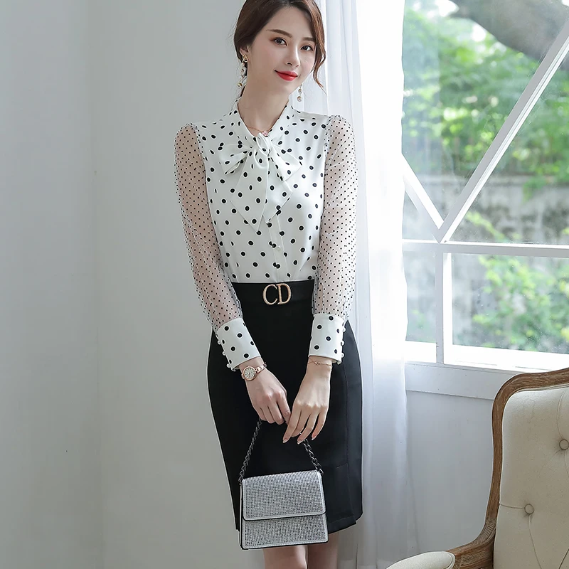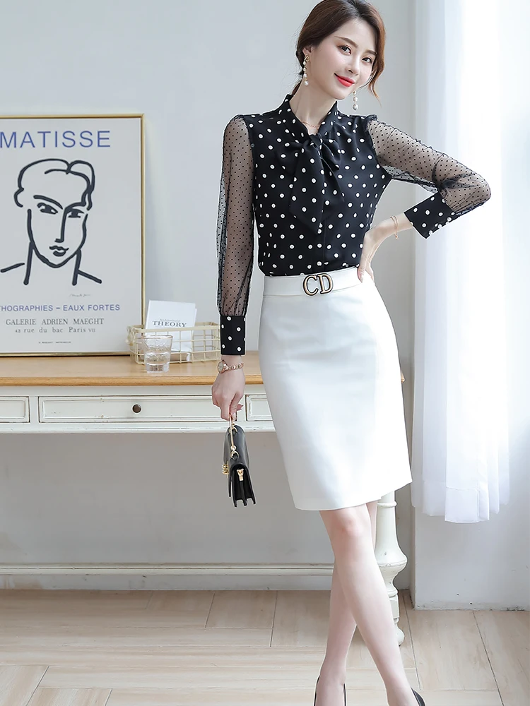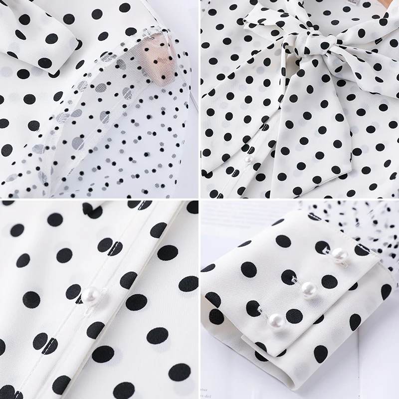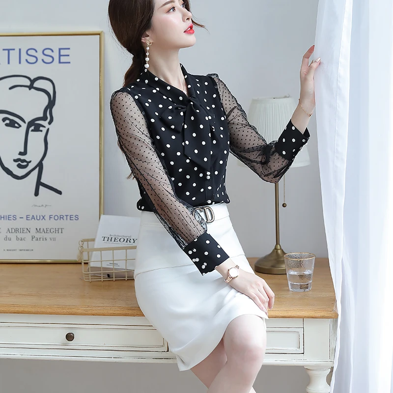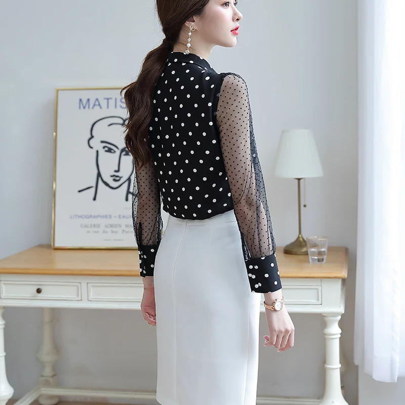 Женская прозрачная сетчатая блузка Lenshin, Повседневная дышащая мягкая блузка в горошек с завязкой, офисный Топ