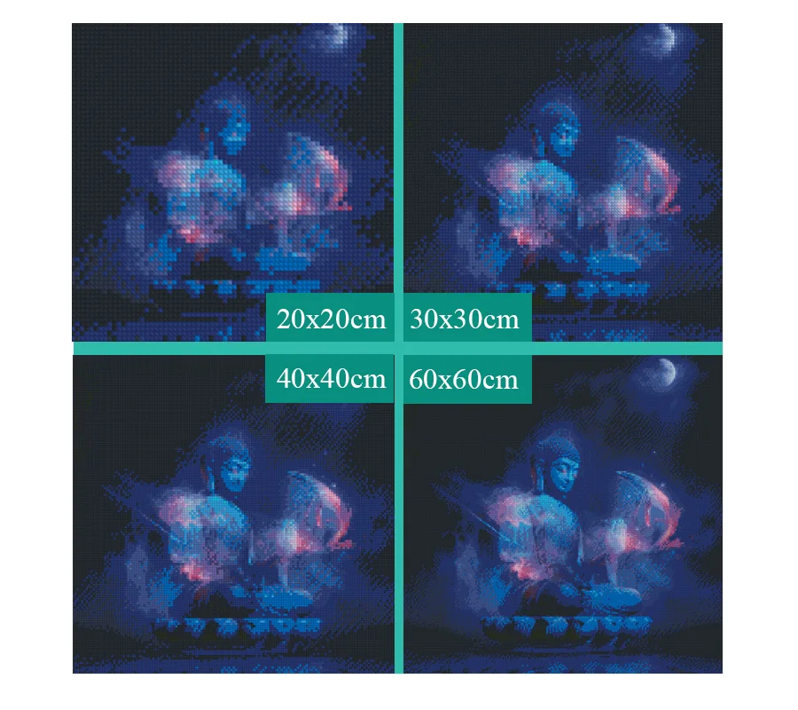 Обычно,Сложные красочные изображения с тонкими деталями требуют большего размера, чтобы выразить детали. И если вы хотите, чтобы общий взгляд на эффект каждого размера, следующее изображение только для справки. Вы также можете оставить нам сообщение, если вам нужен большой размер или у вас есть другие вопросы.