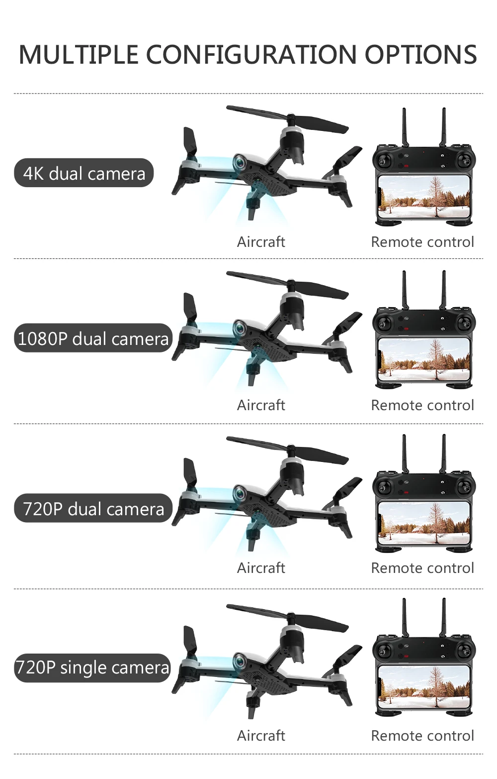 Примечание: ● Версия 720P имеет только одну камеру, Версия 1080P и 4K имеет две камеры ● Продукция упаковывается из пенопласта Особенности: -Встроенная двойная 1080P HD широкоугольная камера настроена изумительно, чтобы снимать Потрясающие снимки и видео с неба. -Позиционирование оптического потока помогает дрону достичь отличной производительности в точном месте, что обеспечивает стабильный полет. -С функцией режима удержания высоты обеспечивает стабильный полет. -С функцией жеста фото и записи Сделайте вашу фотографию более удобной и прекрасной. -Отслеживайте полет, вы можете нарисовать трек полета, который хотите на телефоне и Квадрокоптер будет летать по линии, которую вы окрашиваете. -С помощью функции wifi можно подключить приложение для фотосъемки, видео, передачи в реальном времени через Изображение камеры телефона. -При безголовом режиме не нужно регулировать положение самолета перед полетом. -С помощью одной кнопки для возврата функция позволяет легко найти дорогу домой. -Smart follow, Дрон следует за движущимся пультом дистанционного управления и выполняет функцию следования. -Он может реализовать 3D вращение на 360 ° в четырех направлениях с 4 светодиодный ными лампами. -Технология 2,4 ГГц для защиты от помех. -4 канала, которые могут совершать полет по направлению, спуск, вперед, назад, влево, вправо и вращение на 360 °. -6-осевой гироскоп, который может иметь более стабильный полет и быть простым в управлении. -Аккумулятор большой емкости 3,7 в 1600 мАч поддерживает максимальное время полета 22 минуты. -Фюзеляж квадрокоптера изготовлен из высокопрочного и стойкого инженерного пластика, легкого и долговечного сопротивления. Функция: вверх/вниз, вперед/назад, поворот влево/вправо, боковая f-подсветка, светильник ка светодиодный режим без головы, автоматический возврат одной кнопкой, позиционирование оптического потока, свет трека F, режим удержания высоты, фото жестов, видео жестов