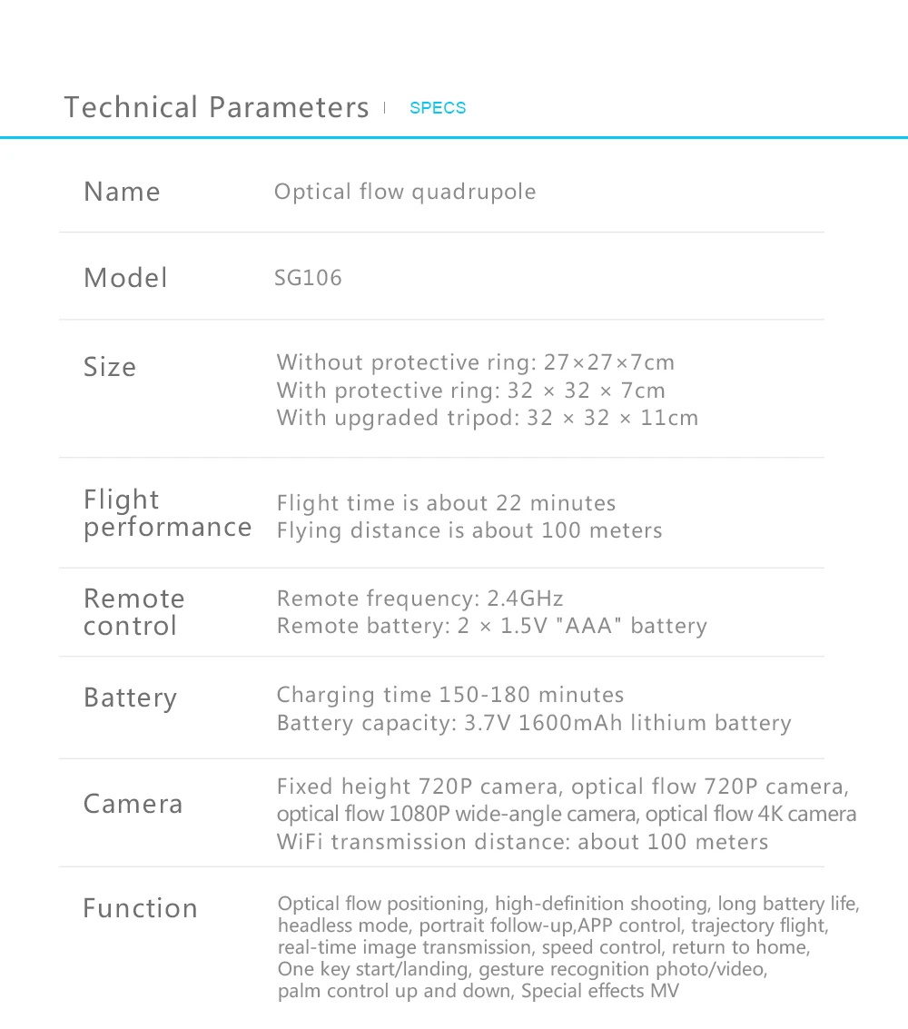 Описание: • Артикул: SG106 • Материал: АБС-пластик • Цвет: черный, белый (на выбор) • Частота: 2,4 г • Канал: 4 канала • Гироскоп: 6 осей • Камера: 720P/ 1080P широкоугольная/4K камера (опционально) • Фото: (720P)1280x720; (1080P)1920*1080; (4K)4096x3072 • Видео: (720P)1280x720; (1080P)1920*1080; (4K)2048x1080 • Нижняя Камера: 1280*720P • Частота кадров: 25 кадров в секунду • Аккумулятор для квадрокоптера: 3,7 в, 1600 мАч, литий-полимерный аккумулятор (входит в комплект) • Батарея передатчика: 2 батареи AAA (не входят в комплект) • Время полета: около 22 минут • Время зарядки: около 150-180 минут • Радиус действия R/C: около 100 м • Размер квадрокоптера: 27*27*7 см (без защитной крышки) 32*32*7 см (с защитной крышкой) • Вес квадрокоптера: 140,6 г • Размер посылка: 33,5*21*8,6 см • Вес посылка: 510 г