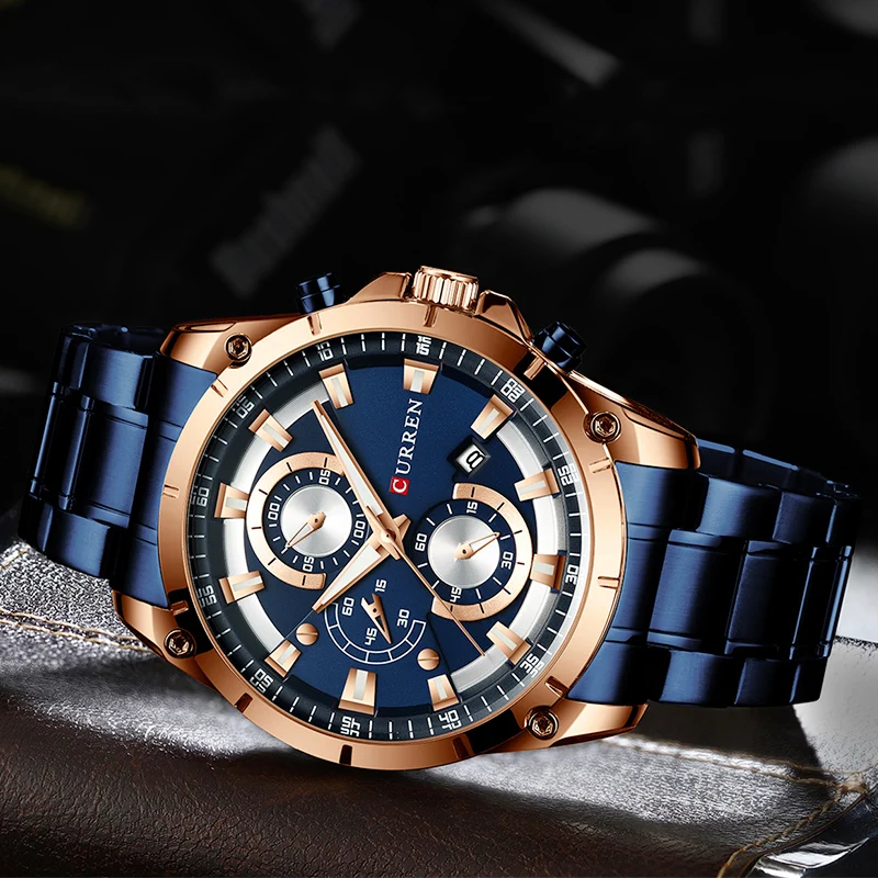 Часы наручные CURREN Мужские кварцевые, брендовые Роскошные модные стальные водонепроницаемые, с хронографом