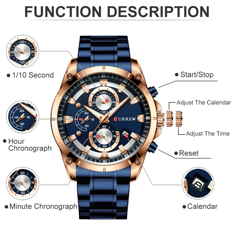 CURREN роскошные фирменные часы для девушек из нержавеющей стали, спортивные часы для мужчин новинка хронографические, наручные часы, модные, повседневные, кварцевые часы, мужские часы Технические характеристики: Диаметр циферблата: 47 мм Толщина корпуса: 14 мм Длина ремешка: 250 мм Ширина ремешка: 24 мм Водонепроницаемость: 30 м Особенности: Часовой механизм: кварцевый механизм компании Time Module (Сделано в Японии) Материал зеркала: Hardlex Гарантия на часовой механизм: 12 месяцев Включенные компоненты: 1 × часы Пожалуйста, обратите внимание: Многофункциональные часы. Все указатели работают. Эти часы имеют секундомер функция. Водонепроницаемость часов: 3bar можно использовать при мытье рук без горячей/теплой водой, нельзя принимать душ в ванной комнате, плавания и т. д
