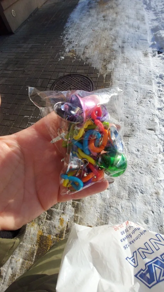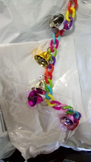 Яркая игрушка из пластика, колокольчики тоже пластиковые. Язычки из колокольчиков попугай быстро оторвал.