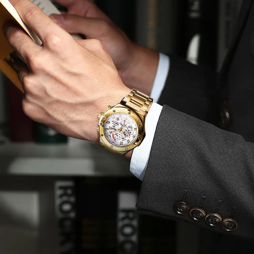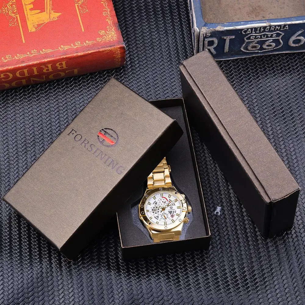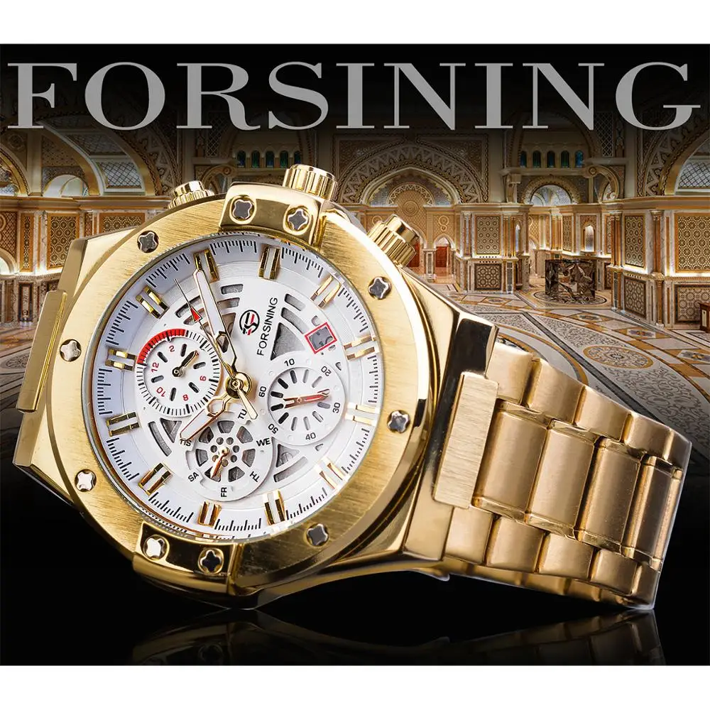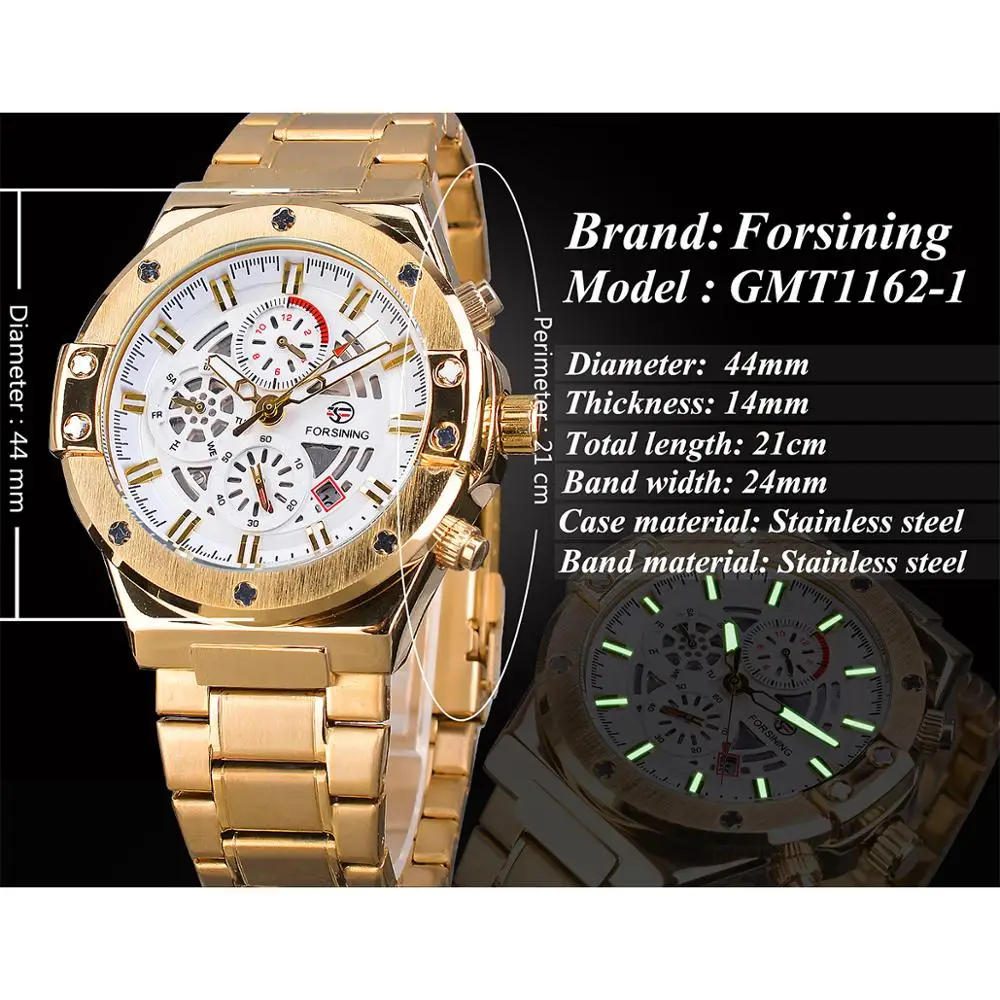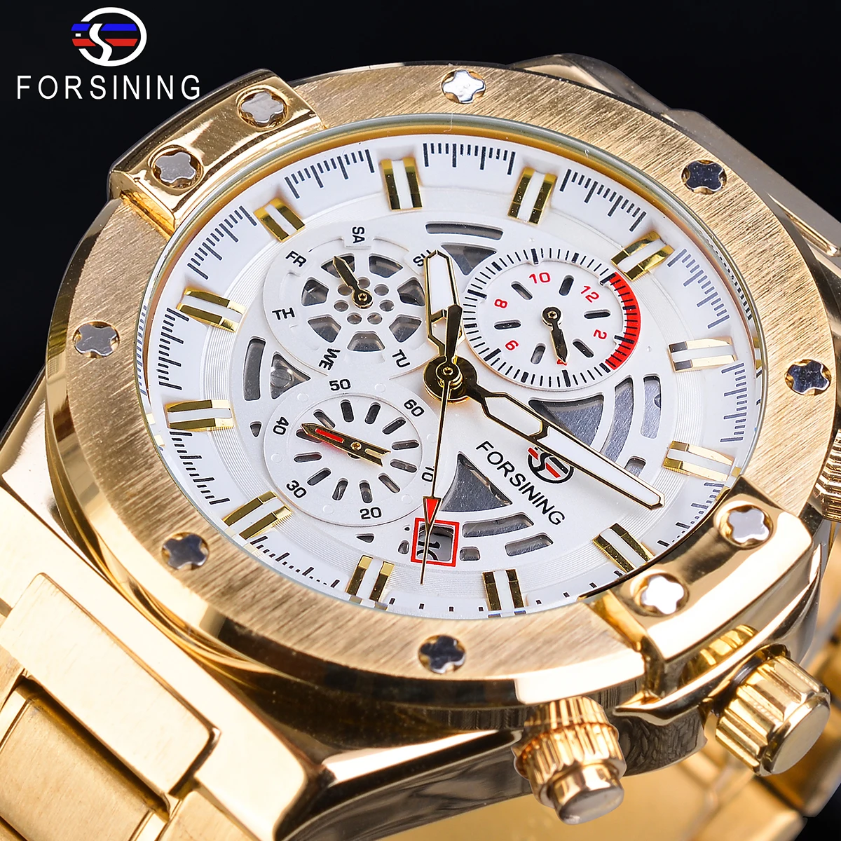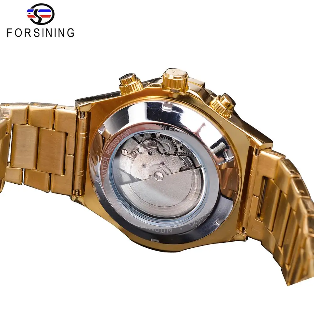 Часы Forsining Мужские механические золотистые с автоподзаводом, 6 стрелок, дата, военные, гоночные, спортивные, ремешок из нержавеющей стали