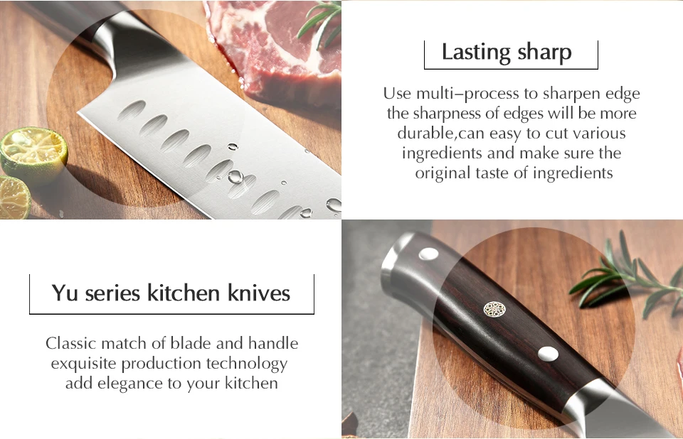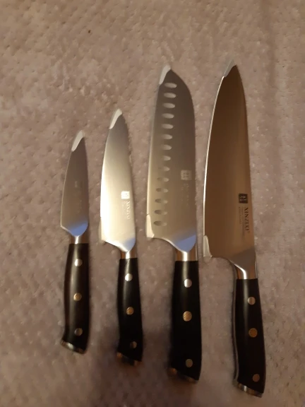Ножи классные и удобные. Соответствует описанию и полностью соответствует моим ожиданиям. Довольно острый и торжественно тяжелый для обработки сырых овощей и мяса без особых усилий. Посмотрите, как долго они будут оставаться таким, но на данный момент я доволен.