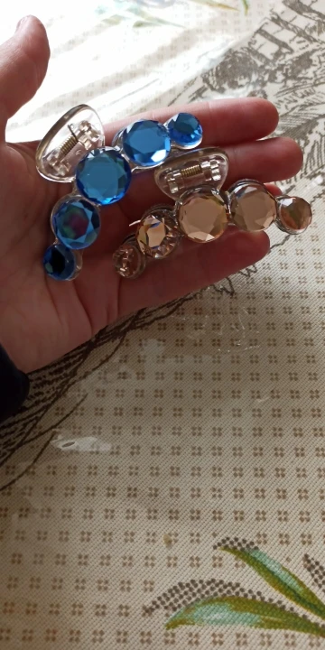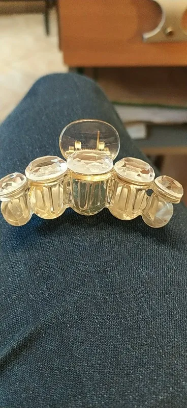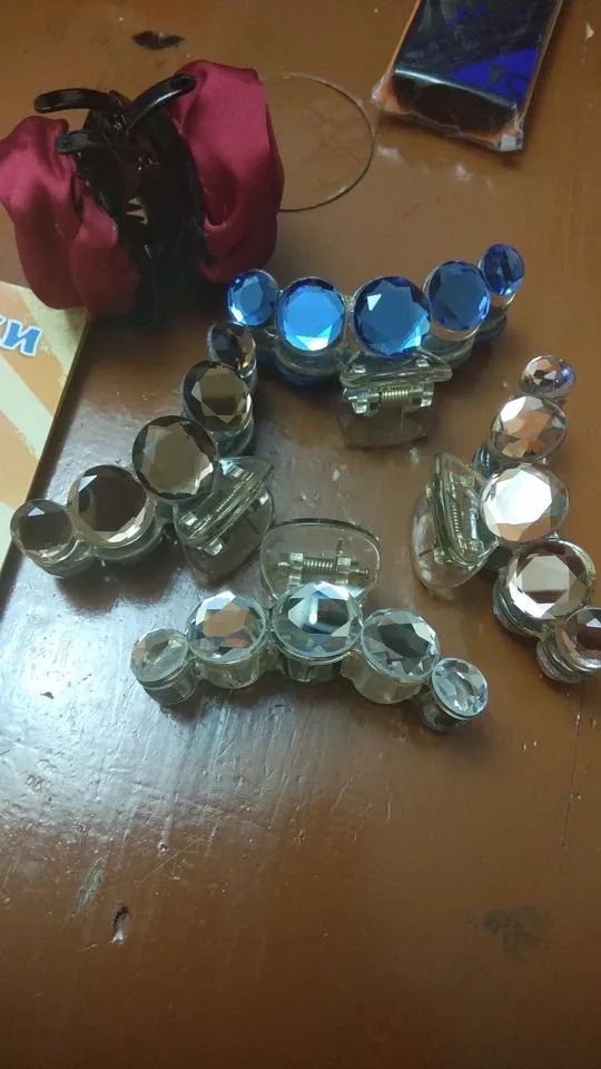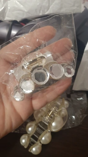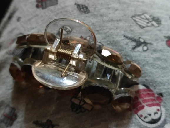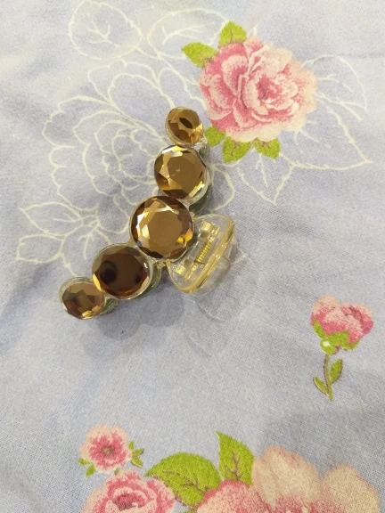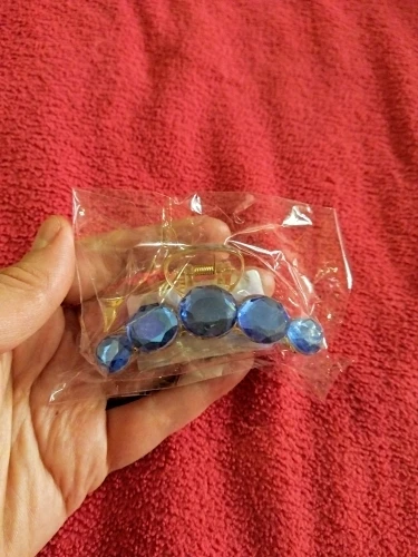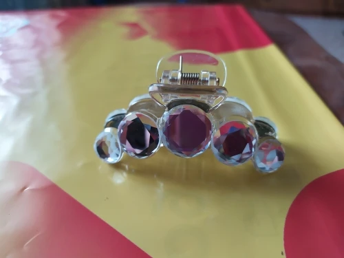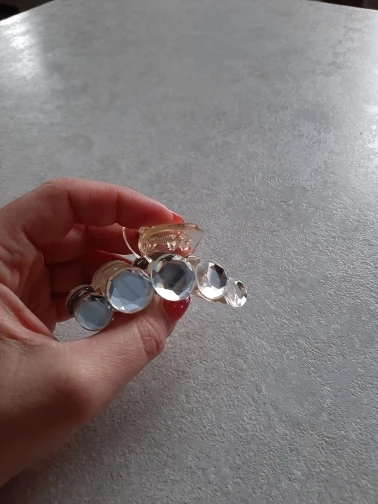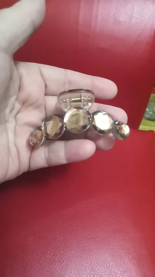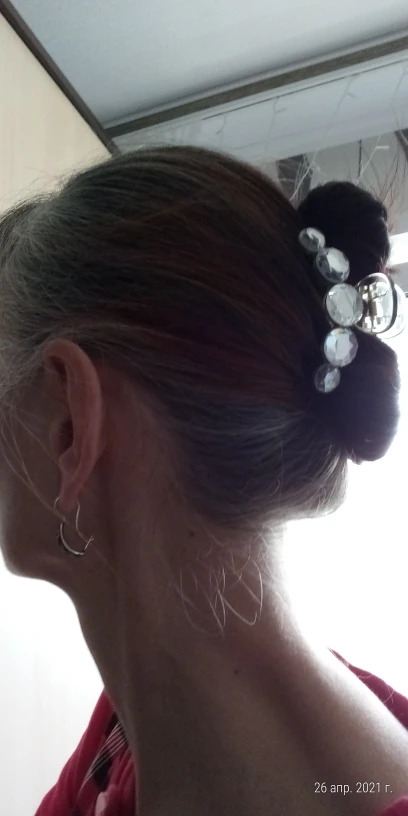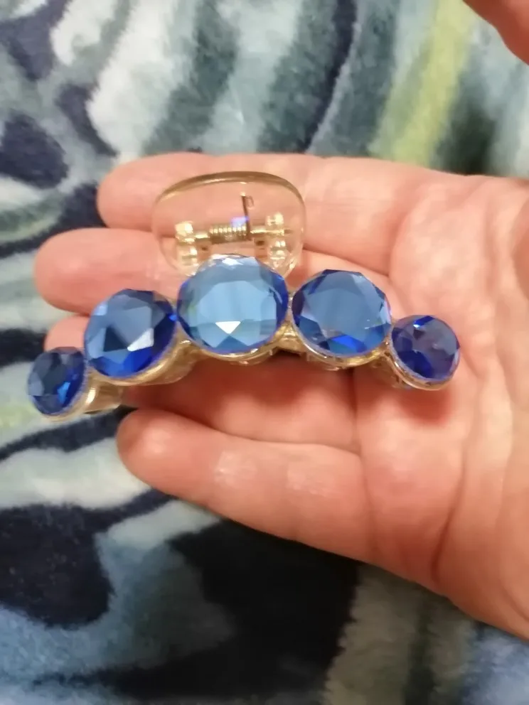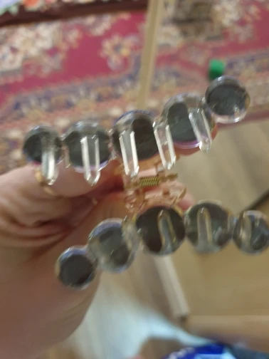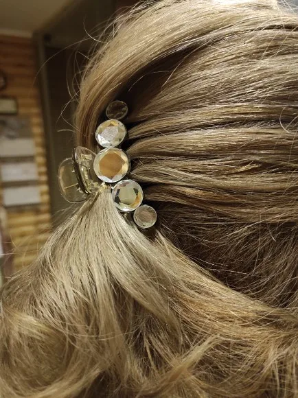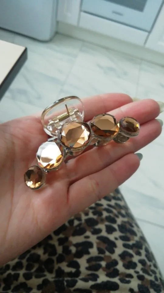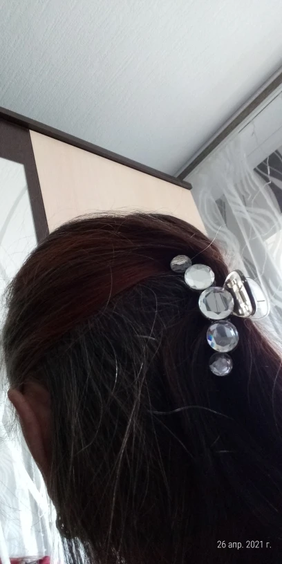 Заколка меньше , чем ожидала, но на небольшой объем волос подойдет. Сбоку у камешков неаккуратная обработка. Издали не видно, но качество страдает..