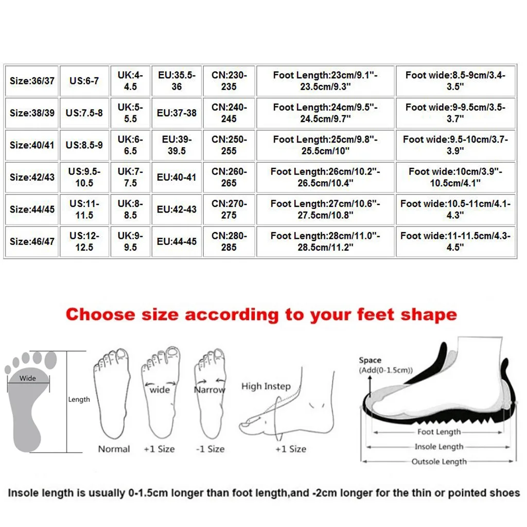 Полезные советы:Различные стили обуви, пожалуйста, выберите размер в соответствии с вашим типом стопы.
