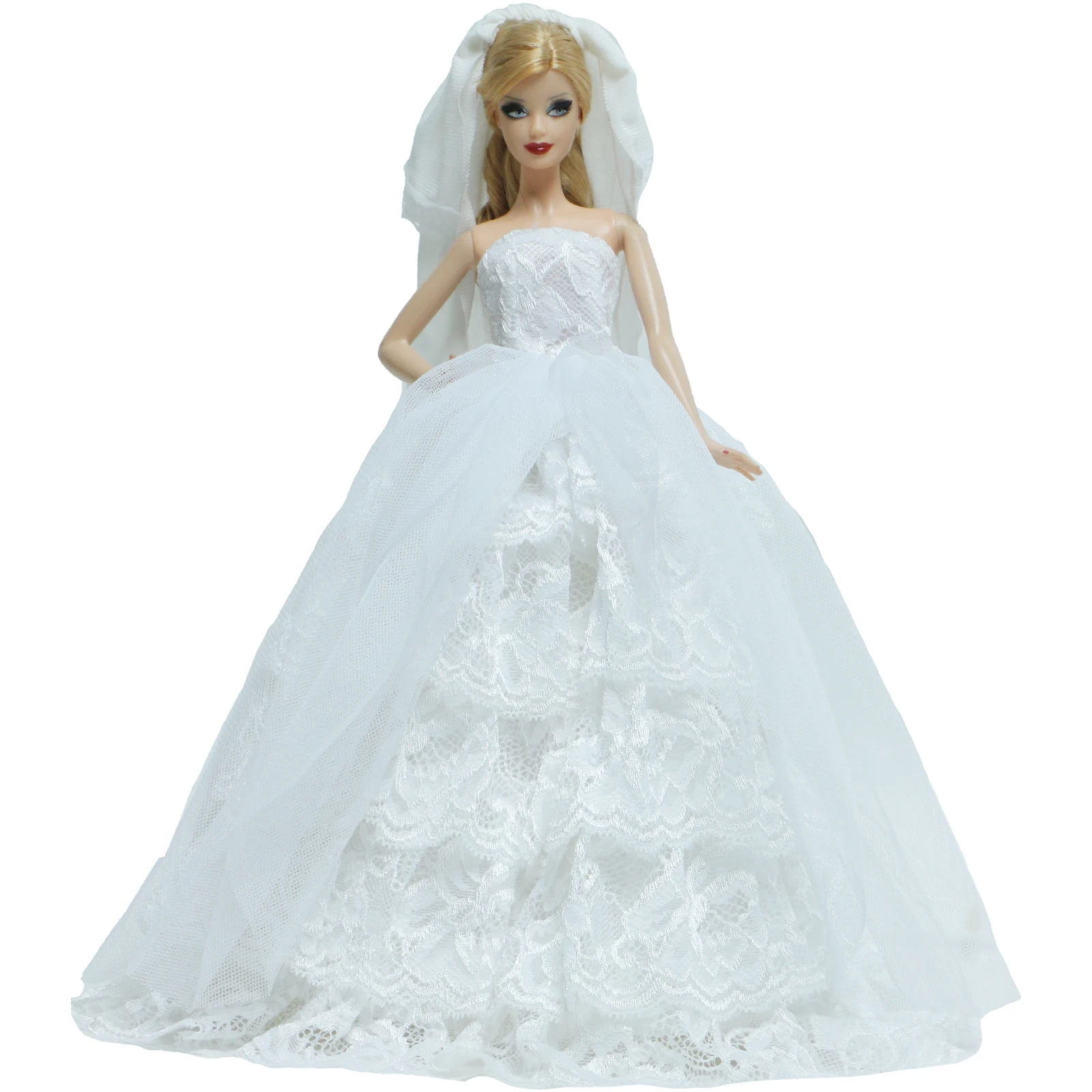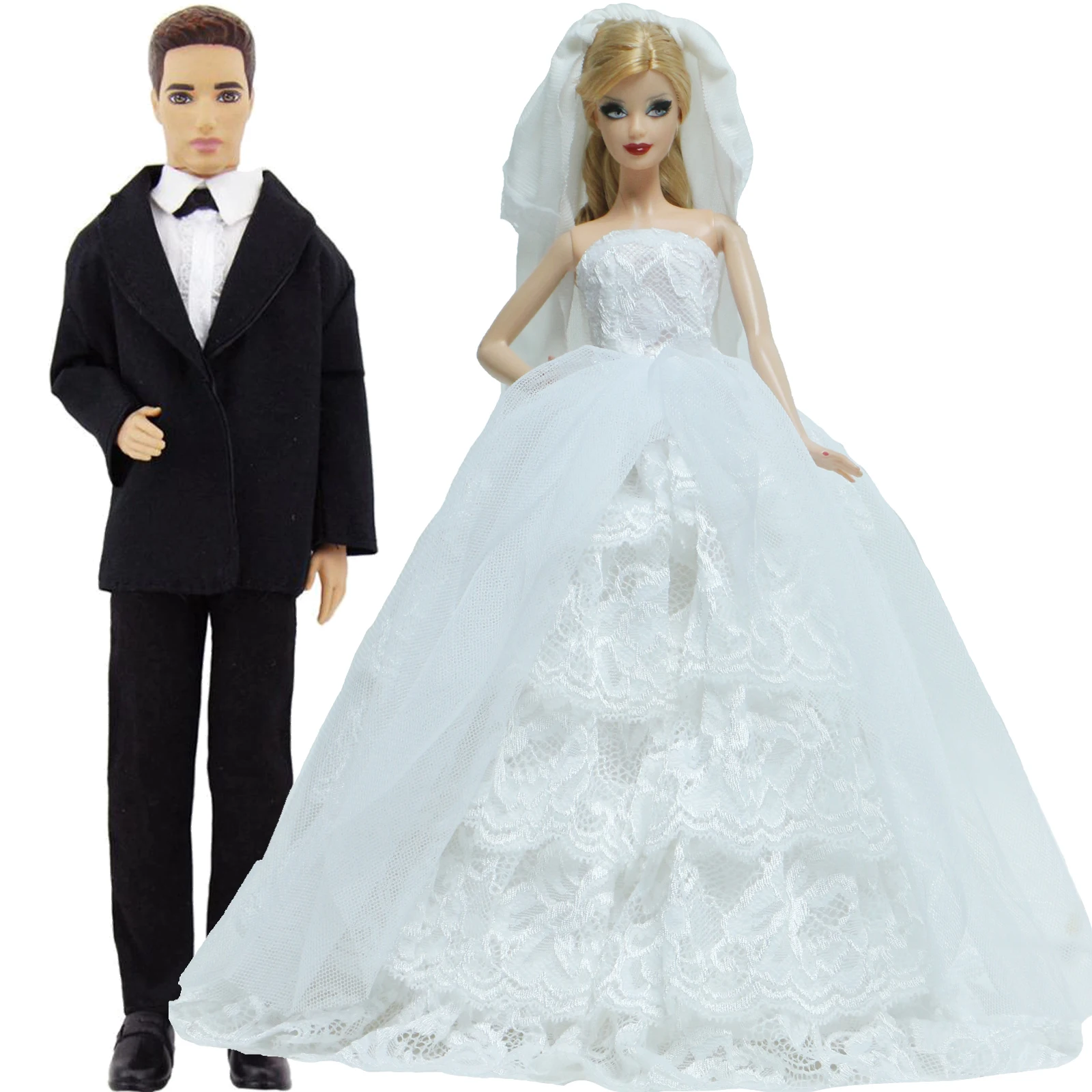 Комплект одежды, белое кружевное многослойное свадебное платье + мужской костюм, смокинг, платье принцессы, аксессуары, Одежда для куклы Барби, для куклы Кена