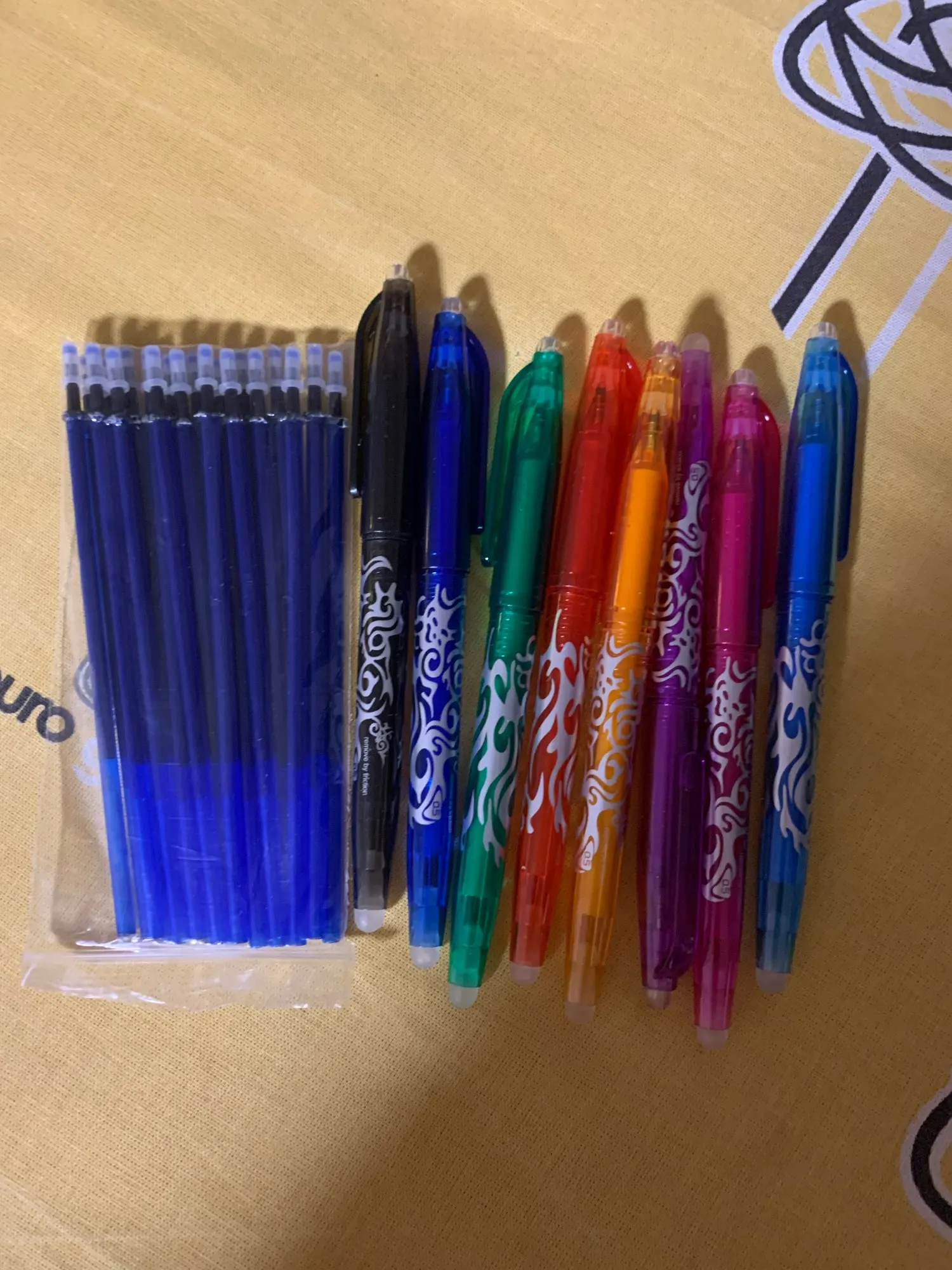 В Украину стержни шли чуть больше 3 недель. Пришло ровно 20 штук, цвета разные, как на фото. Для рисования на ткани отлично подходят, после проглаживания следов не видно (я пока не пробовала черный и темно-синий цвета), а на бумаге легкий след от написанного все же есть (но я пробовала стирать не отдельным ластиком, а встроенным в корпус ранее купленной ручки с исчезающими чернилами, возможно отдельный ластик будет давать лучший результат). Очень довольна покупкой!