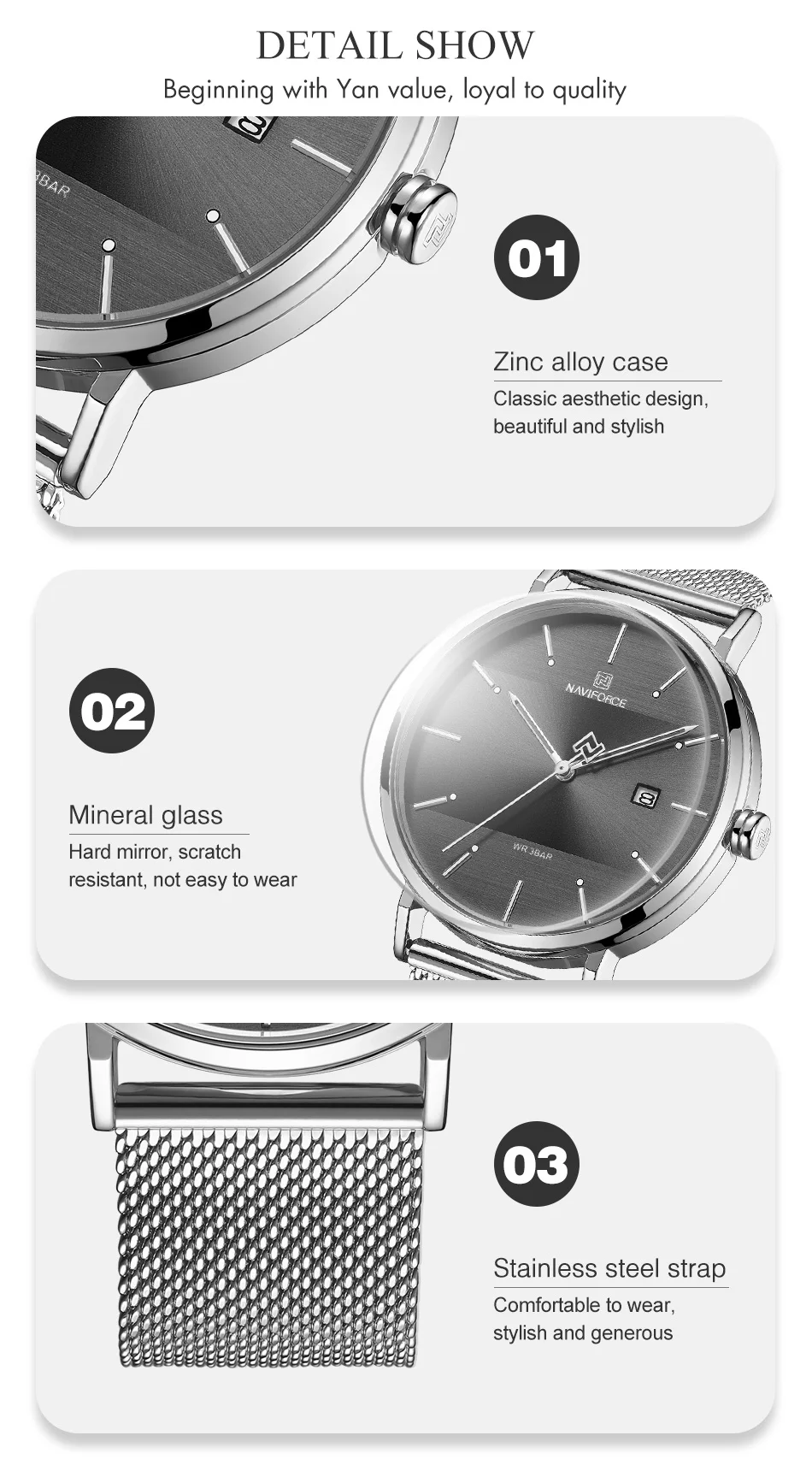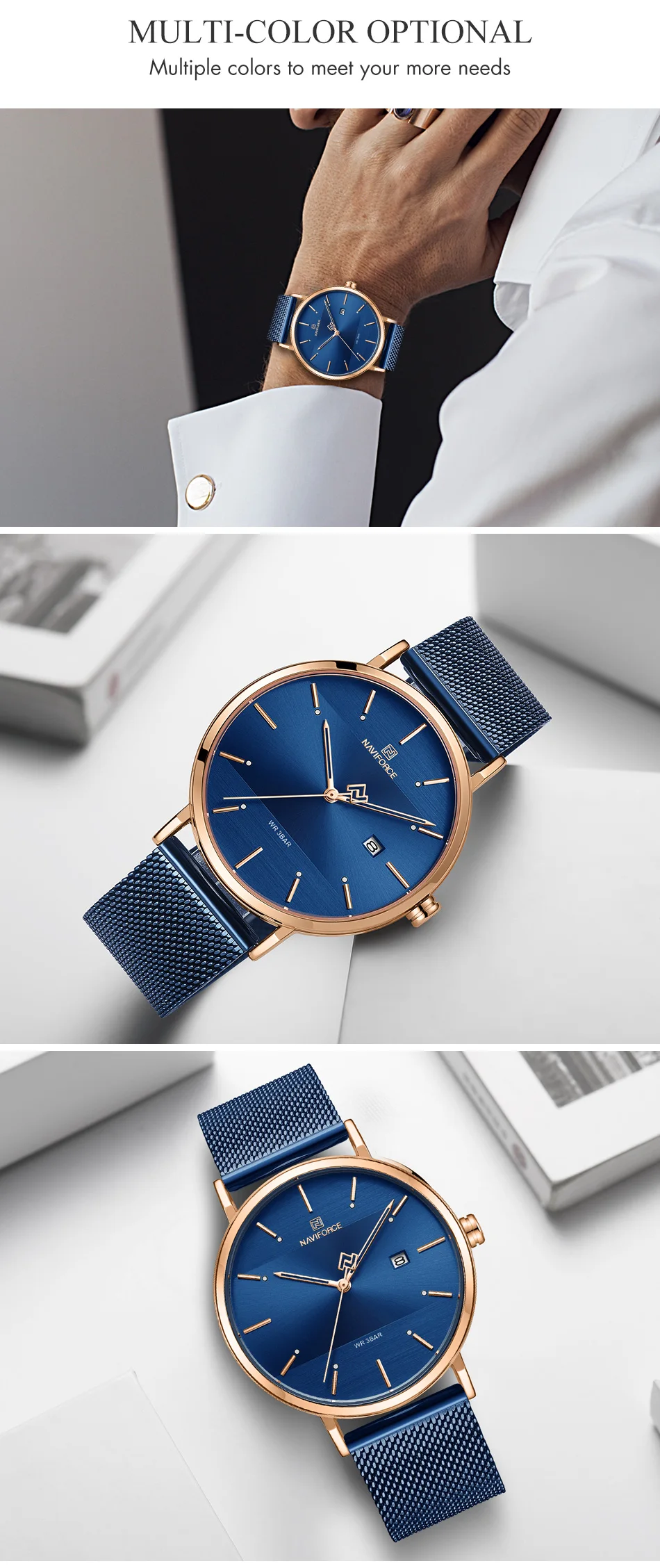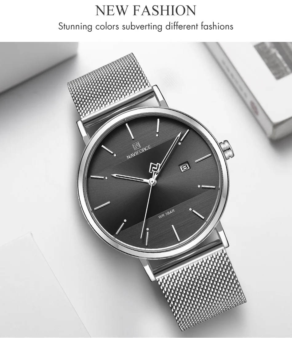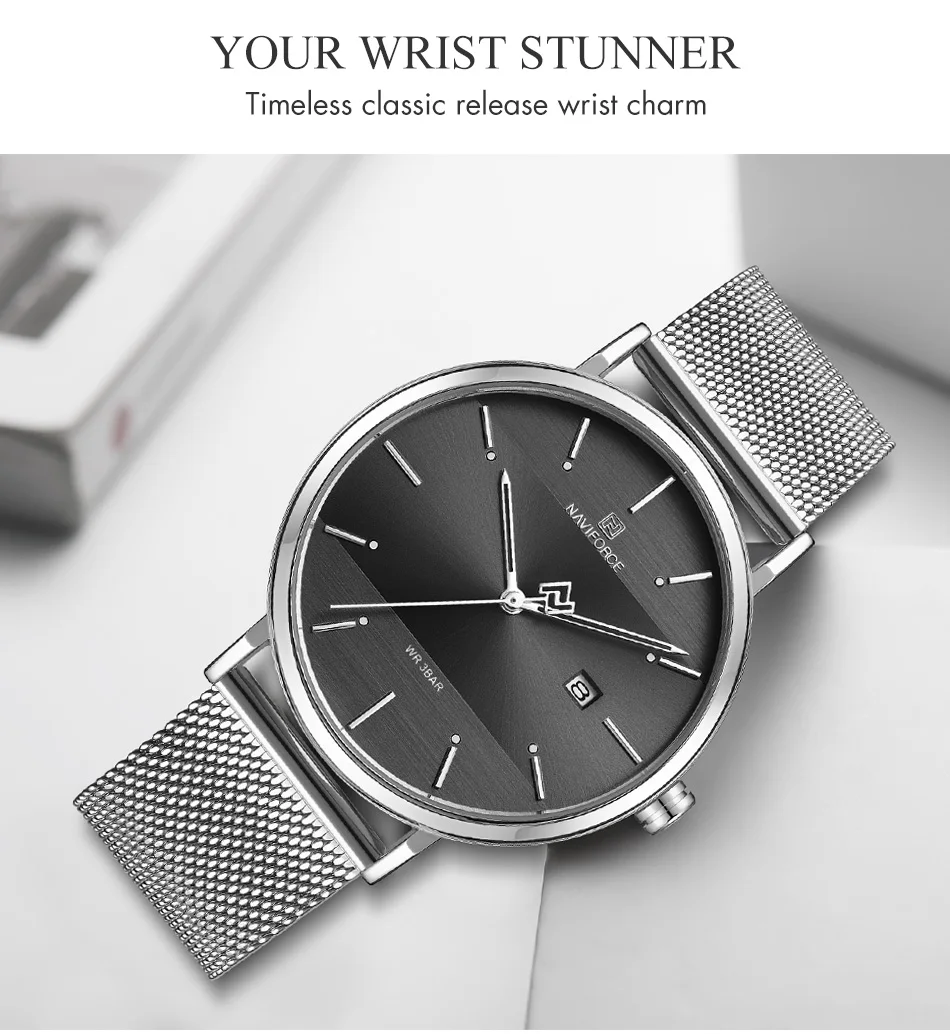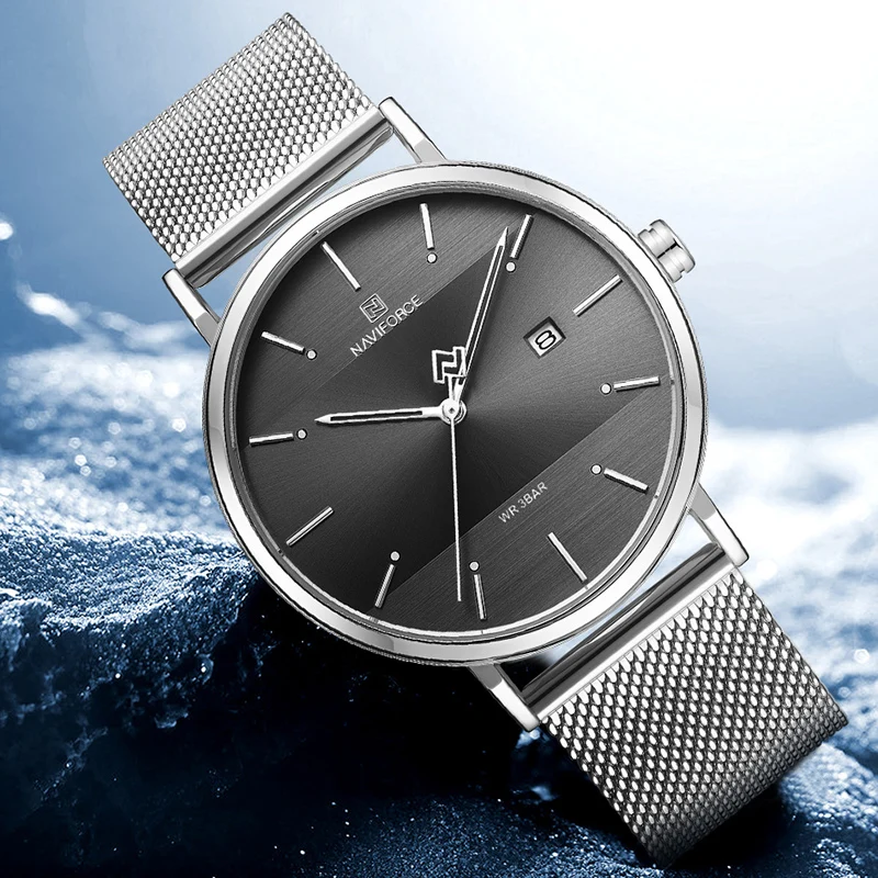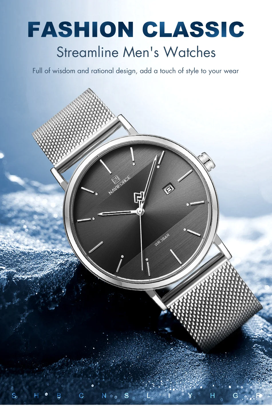 Часы наручные NAVIFORCE Мужские кварцевые, брендовые Простые Стальные сетчатые водонепроницаемые с коробкой