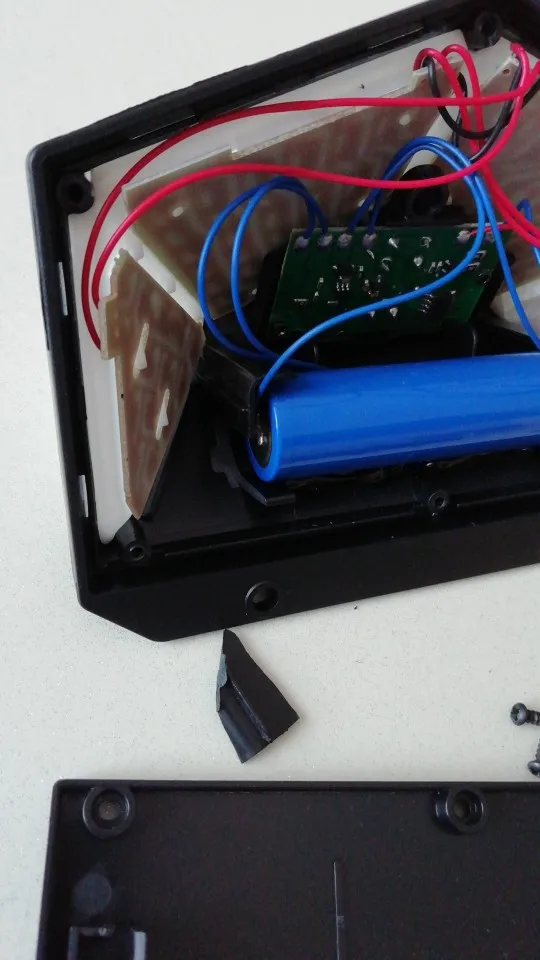 Фонарь работает, но гремело внутри при переворачивании корпуса фонаря. Отвернул саморезы крышки, а там отломлено гнездо для аккумулятора. Это произошло не при транспортировке, такое возможно только при сборке. Теперь болтается батарея. Подлость, ведь видел китаец, что отломил пластик и закрыл крышкой. Гаденыш.