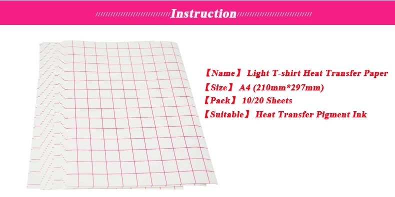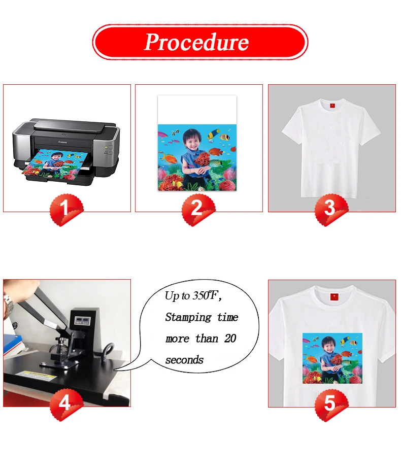 Описание(1) Цвет: светильник(2) Размер: A4 (297 мм * 210 мм)(3) Тип передачи: термопереводная бумага(4) использование для: струйных принтеров(5) Подходит для одежды из 100% хлопкаПереводная бумага простая в эксплуатации, хороший эффект, Горячая слеза, не имеет значения, используйте электрический утюг или профессиональную пирографическую машину.Высокая прозрачность и высокая проницаемость. Сильные в пирографе чернила моющиеся.Руководство по эксплуатации(1) печать:О: Установите струйный принтер в режим [Imaging], выберите тип бумаги как [Обычная бумага]B: оставьте напечатанную бумагу для сушки в течение 5 минут, после обрезайте пустую сторону и оставьте края 5 мм.(2) передачаA: подогрейте машину теплового пресса около 2 минут, установите температуру до 160 ℉B: Положите напечатанную бумагу на ткань и сильно нажмите на нее 20 секунд. Бумага меньше, время меньшеC: Поднимите машину, выньте ткань и быстро разорвите бумагуD: если используется железо, мы предлагаем температуру до 180 ℉, время около 2-3 минут с равномерной скоростью.(3) стирка:О: следует подождать 24 часа, а затем постирать тканьB: во время стирки, пожалуйста, поставьте изображение внутрь, с 80 ℉ -100 water водой или холодной водойC: Не используйте отбеливающие материалы или сильно щелочной стиральный порошокD: Не трите изображение сильно и оставьте его только на воздухе.