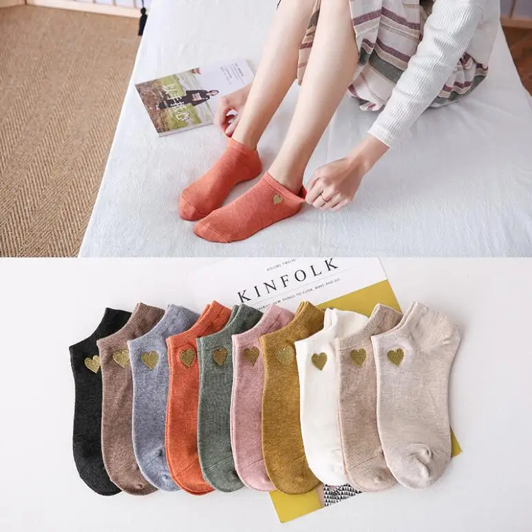 Новые носки с принтом в форме сердца, женские японские хлопковые носки короткие носочки по щиколотку с вышивкой Золотого сердца, 10 пар в партии