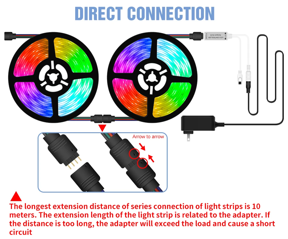* Самый длинный дальний светильник-полоса-20 метров. Длина удлинителя ленты на светильник зависит от адаптера. Если расстояние слишком длинное, адаптер превысит нагрузку и вызовет короткое замыкание.