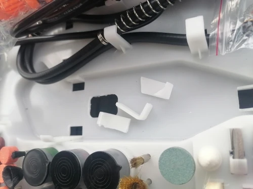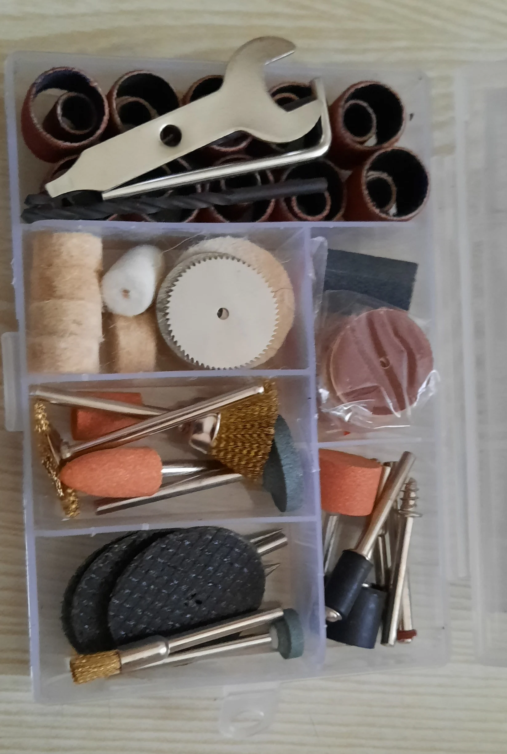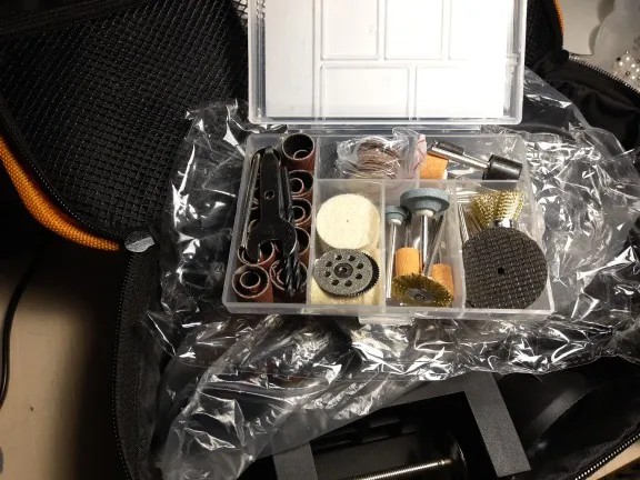 Заказ получил. Посылка пришла достаточно быстро с Российского склада - 7 дней. Курьер доставил заказ до двери (спасибо транспортной компании IML). Бумажная коробка в себе скрывала сам дремель и всяческие аксесуары - бокс с приспособами, защитный кожух, гибкий удлиннитель, крюк-подвес, струбцину для его крепления к столу, ключ для затяжки патрона, пара запасных щеток двигателя. Кстати, заказанная сумка, в которую я благополучно вместил все это добро, была прикреплена отдельно к моей основной посылке, видимо это тонкости сбора каждого конкретного заказа ;)