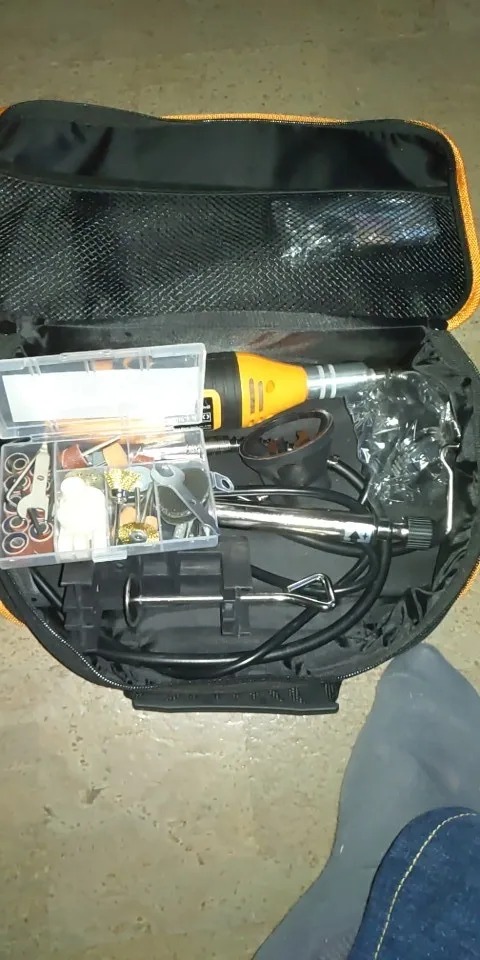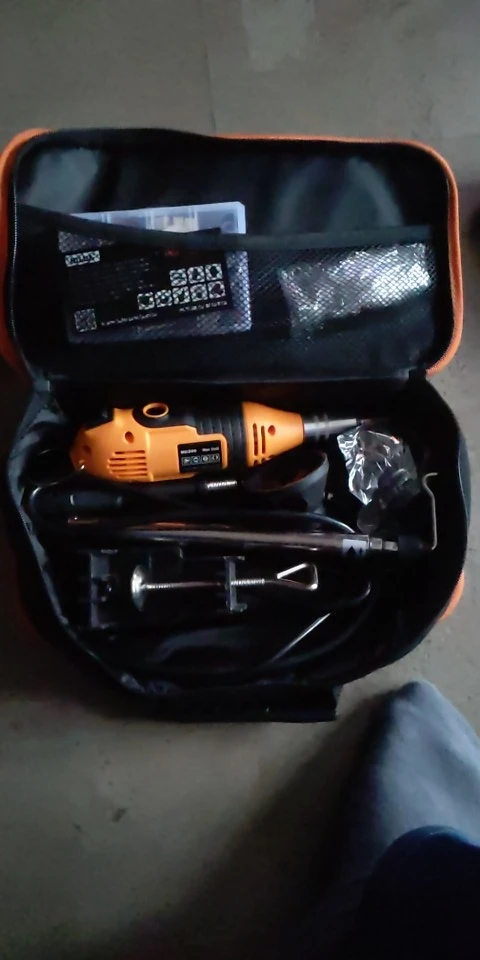 Привезли курьером за 3 дня в Москве, упаковано надёжно, все работает. Брал специально с чехлом, а не в пластиковом чемоданчике. В комплекте струбцина для крепления к столу и подвешивания, в чехле легко помещается куча именно нужных расходников, а не тот минимальный тренировочный наборчик, который идет в сете! Рекомендую к приобретению! Отличной функцией является регулировка скорости вращения, очень полезно при работе с разными по твердости материалами.