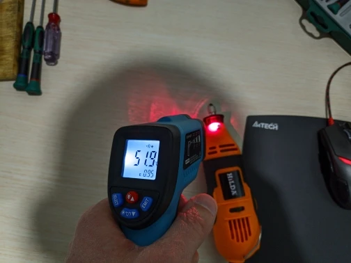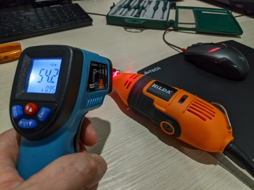 Гравер по большей части понравился. Биение практически нулевое, если правильно установить бор уперев хвостовик в конусное дно (получается не с 1го раза). Не понравился только нагрев. Если при гравировке держать гравер как ручку, то на 3-ей скорости минут через 10-15 гравер разогревается у основания до 52 градусов, металлическая кнопка до 54. При этом уже держать гравер сильно не комфортно, начинает жечь. Подумал, что подшипники не смазаны, разобрал - вроде в подшипниках есть смазка, крутятся плавно, не звинят и не шумят. На переднем подшипнике люфт отсутствовал вообще, на заднем был небольшой. Обильно промыл подшипники WD-40, аж начали звенеть при прокрутке. Потом заново обильно смазал смазкой с содержанием цинкового порошка не разбирая подшипники, под давлением из шприца (по видео с Ютуба). Собрал - греется точно также. Снова разобрал, проверил, лишнюю смазку выдавило из подшипников, все вычистил чтобы не накапливалась грязь. Итог - внутрь лезть бесполезно.