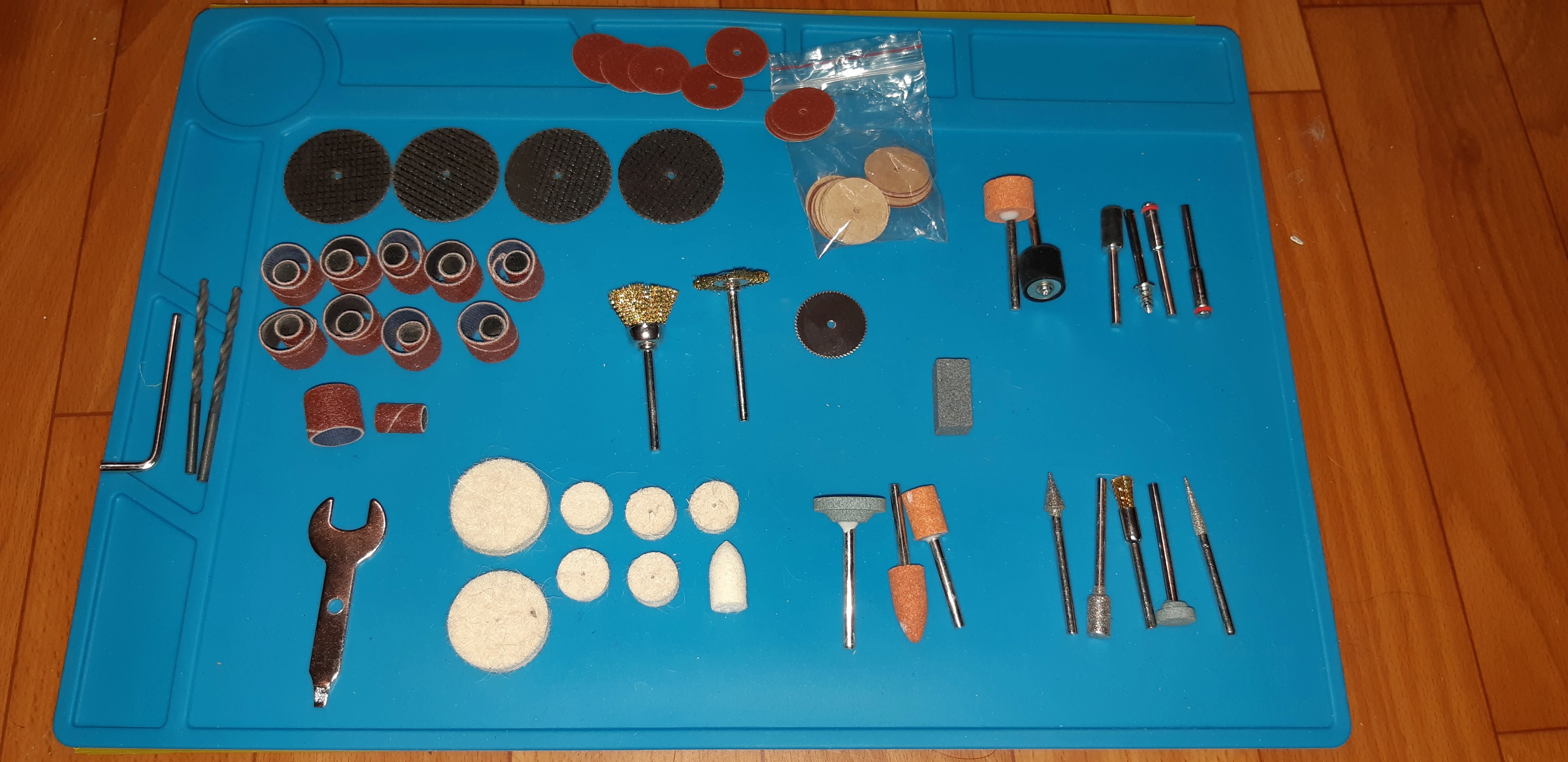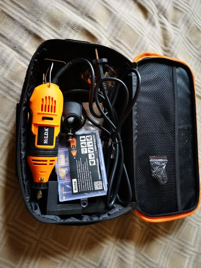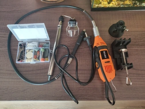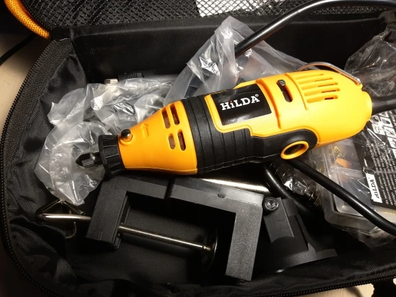 Долго расписывать нечего. В Москве доставка за 3 дня. Брал с сумкой комплект. Коробка с фрезами и прибамбасами очень маленькая, еле помещается типовой набор. В данной комплектации отсутствуют цанги разного калибра, что не есть гуд. Отдельно сразу надо заказывать кулачковый патрон, чтоб не заморачиваться со сменой цанг. Ну и конечно надо покупать насадки покруче, копеечные не работают, только так, для пробы сил и аппарата. Перед началом работы сразу всю Хильду разобрать и хорошенько смазать все агрегаты и валы, особенно гибкий. Там смазка вообще отсутствует. Всем самоделкиным удачи!