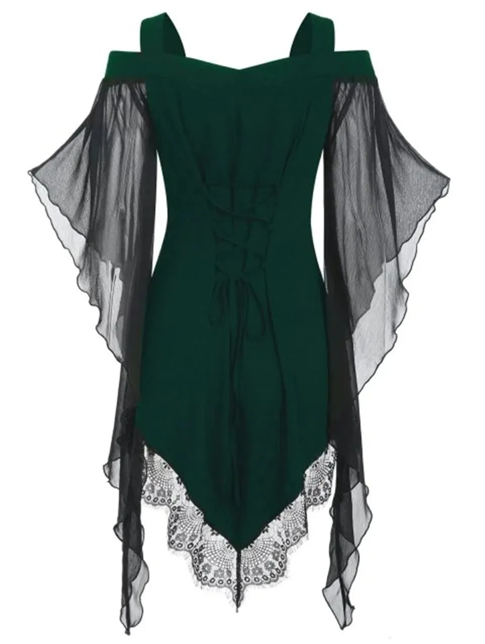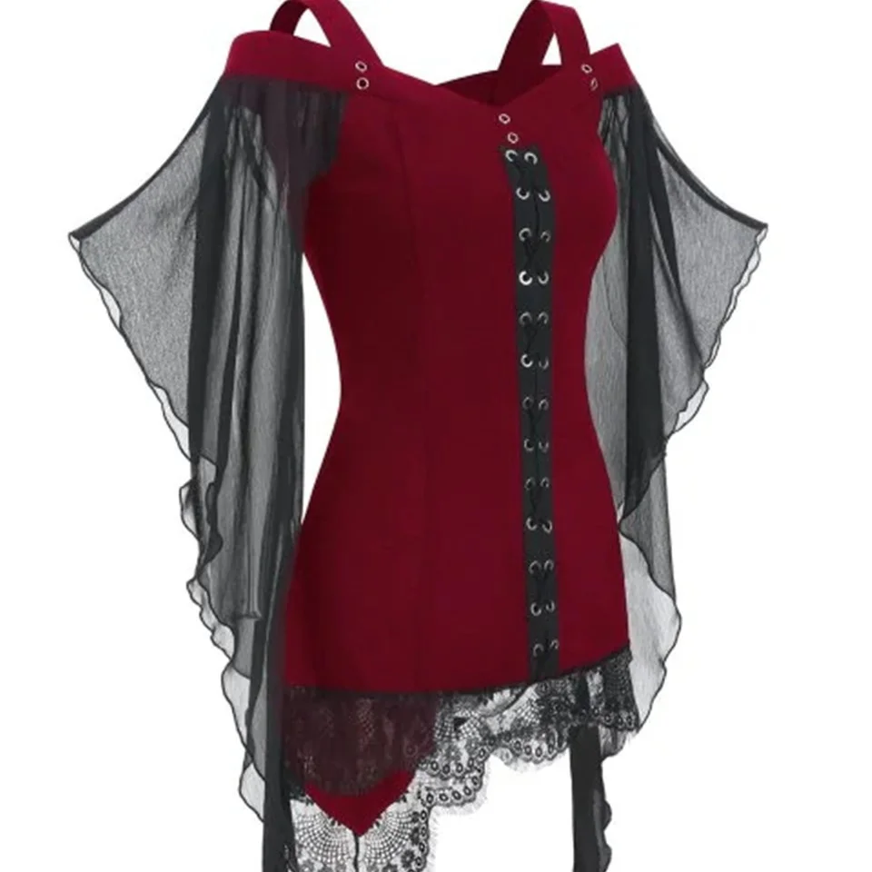 Женские готические черные рубашки на Хэллоуин, женская блузка, модные красные бандажные топы, сексуальная шифоновая рубашка с открытыми плечами и кружевом, размеры до 5XL