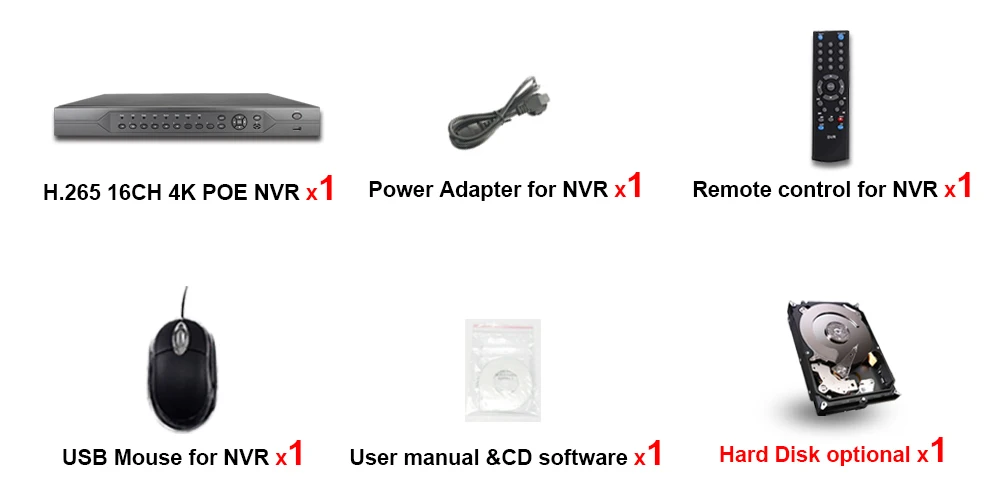 1 сетевой видеорегистратор 16 каналов 4K POE NVR;1 x Кабель питания для сетевого видеорегистратора;1 USB-мышь для сетевого видеорегистратора;1 компакт-диск с программным обеспечением для сетевого видеорегистратора;1 х пульт дистанционного управления для сетевого видеорегистратора;Жесткий диск опционально!
