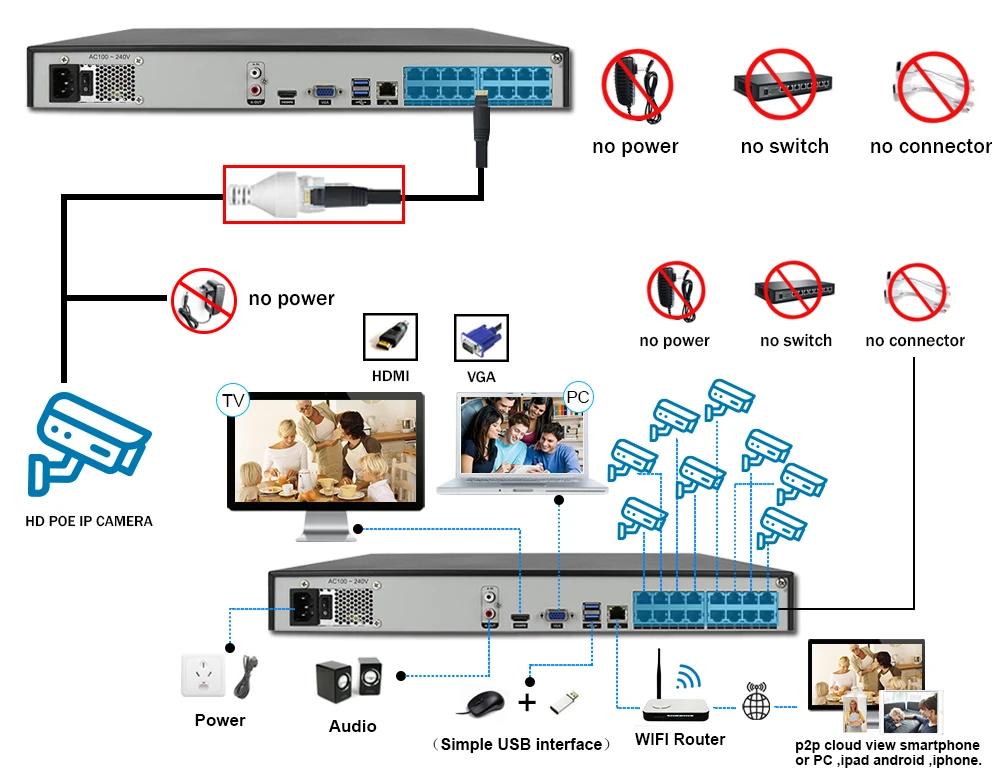 Не нужны дополнительные силовые кабели, адаптеры или переключатель. Подключи и играй и простая настройка.Экономия денег и удобство, POE NVR = переключатель NVR + POE