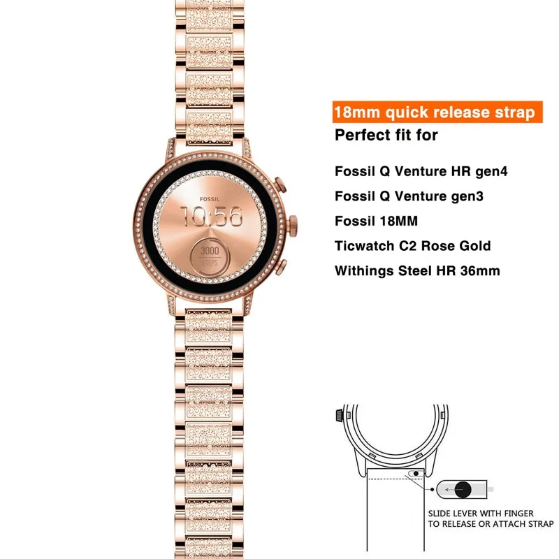 Для Fossil Q Venture Gen3Gen4 HRTicWatch C2 ремешок для часов 18 мм быстросъемный металлический сплав Bling Crystal Bling Хрустальный Браслет