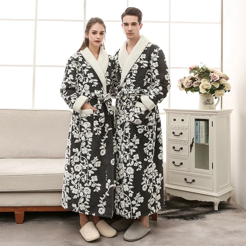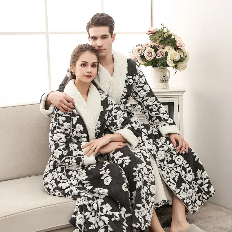 Зимний теплый жаккардовый роскошный длинный халат из кораллового флиса для женщин и мужчин, Фланелевое кимоно для влюбленных, утепленный банный халат, одежда для сна, Халат