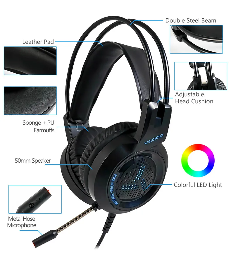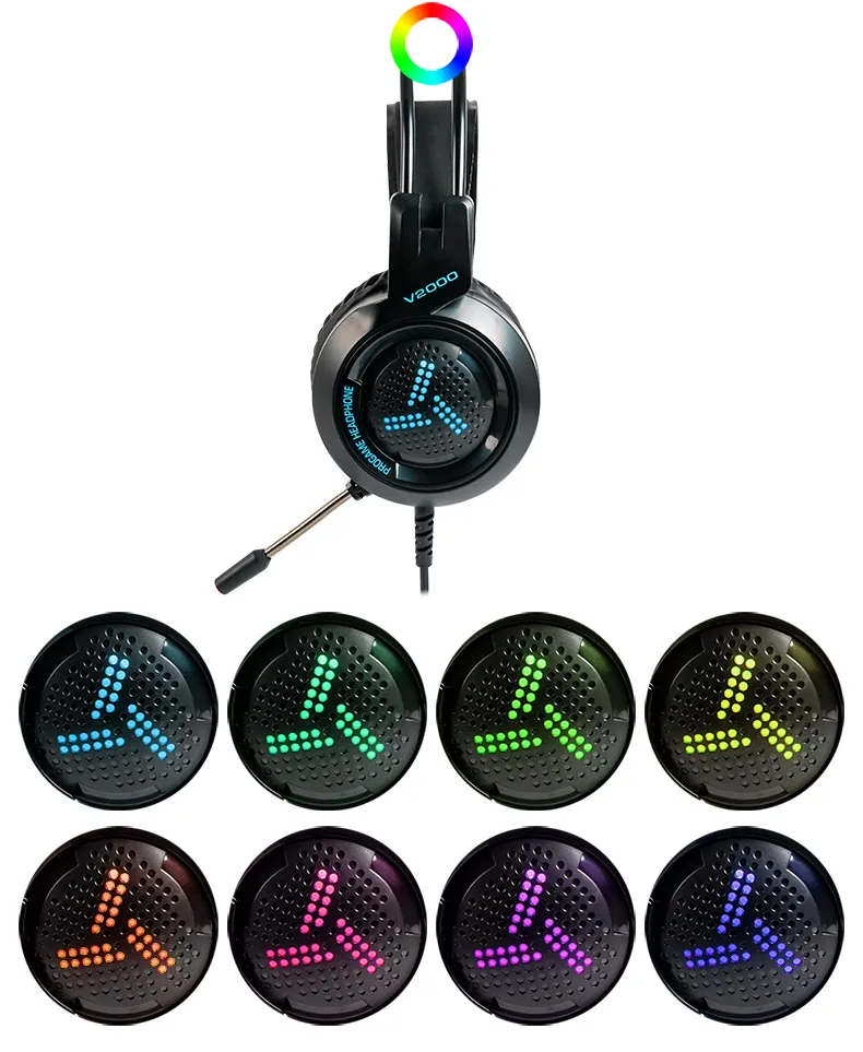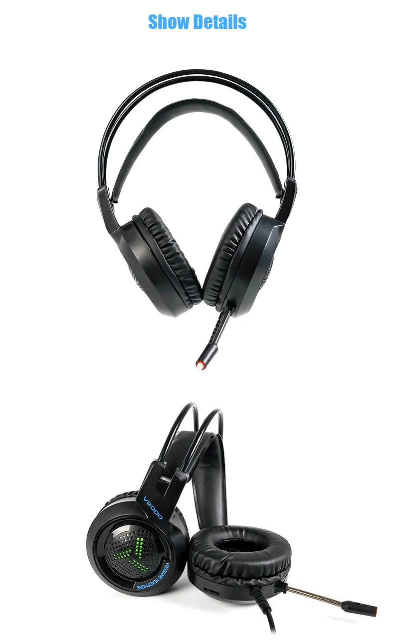 Только одного порта USB имеют 7.1 объемный звук, 3,5 аудиоразъема-не 7.1 объемный звук Особенности:(1). Изготовлен из квалифицированного материала с тонким мастерством, долговечен в использовании.(2). Приятные для кожи амбушюры, дышащие и удобные в носке в течение длительного времени.(3) встроенное высокочувствительное шумоподавление микрофона.Крутое освещение RGB подчеркивает атмосферу игры и предлагает потрясающий визуальный опыт.(4). 3,5 мм Plug and USB с одним разъемом доступны для выбора.(5). Канал 7,1 обеспечивает высокое качество звучания басов.(6) Высокий эластичный луч декомпрессии дизайн обеспечивает компактное ношение чувство.(7). Профессиональный дизайн для компьютерных ПК геймеров ноутбуков.(8). Эргономичный дизайн, высококачественные наушники из искусственной кожи с белком, удобные и прочные в носке, независимая структура полости, высококачественный стереозвук, Звук Прозрачный, емкостной Электрет-микрофон, четкая и прозрачная передача голоса.Посылка включает в себя:1 x игровая гарнитура V2000 (без коробки) Примечание: светильник и различные дисплеи могут привести к тому, что цвет товара на картинке немного отличается от реального. Допускается погрешность в 1-3 см.