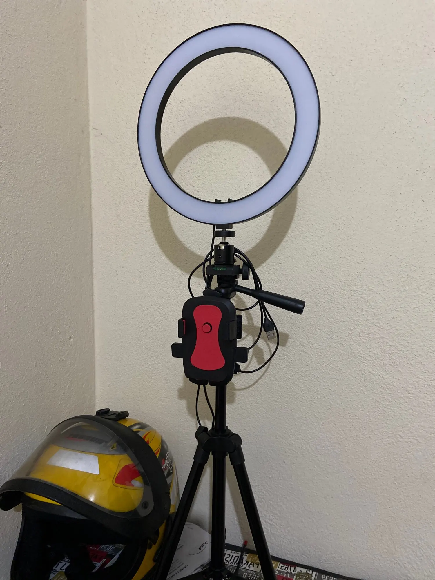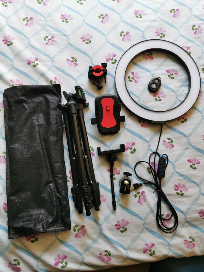 Ножки шаткие, но телефон спокойно держит. Всё работает. Клапаны на ножках застегиваются. За свою цену полностью оправдал! Посылка пришла за 7 рабочих дней. Я довольна. Ничего собирать не нужно (я думала ножки нужно прикручивать). В итоге сообразила сама, мужа не просила. 3 режима света, работает лампа через USB кабель (я втыкала в блок от айфона, работает). Сделала фото Рядом, чтобы была видна высота. Я брала для селфи. Очень круто !!! Купила весь набор за 1700. С продавцом не общалась, доставка была черёд сдэк. Привезли домой. Всё было целое.
