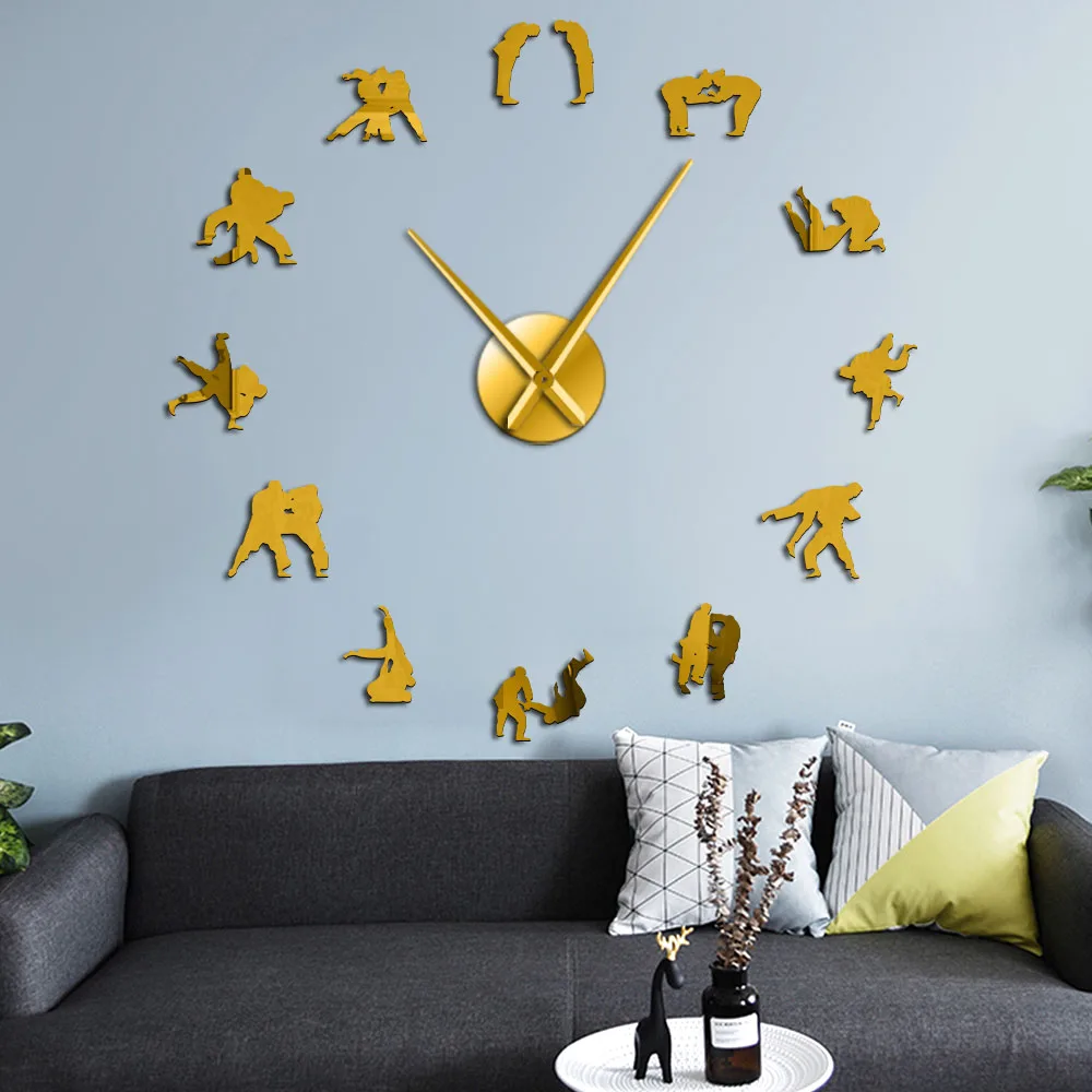 Японские боевые искусства дзюдо игроки силуэт DIY настенные бесшумные кварцевые большие настенные часы дзюдо борец гигантская подвесная бескаркасная стена