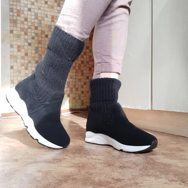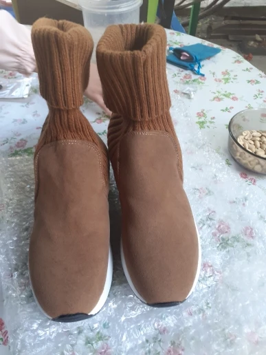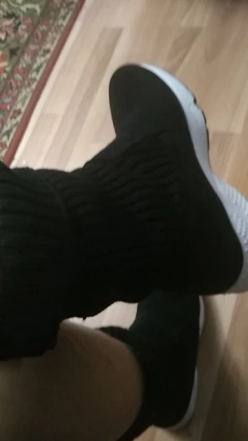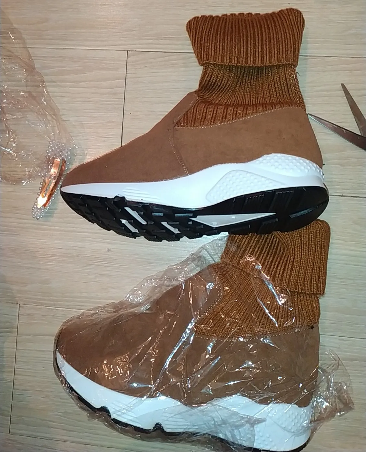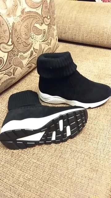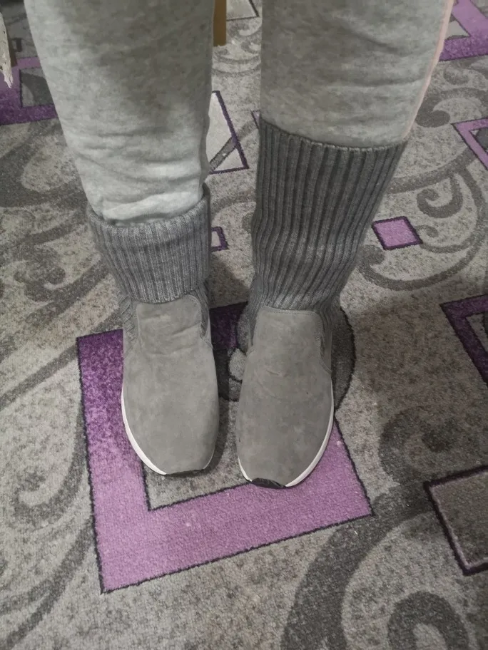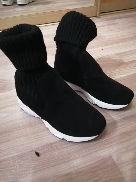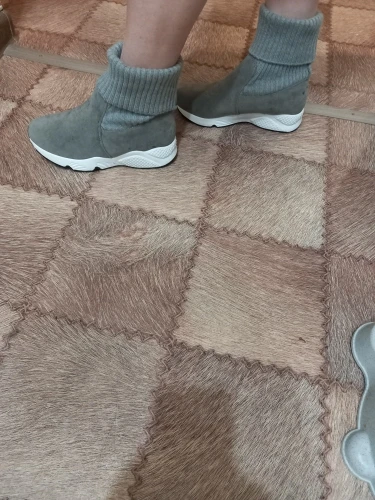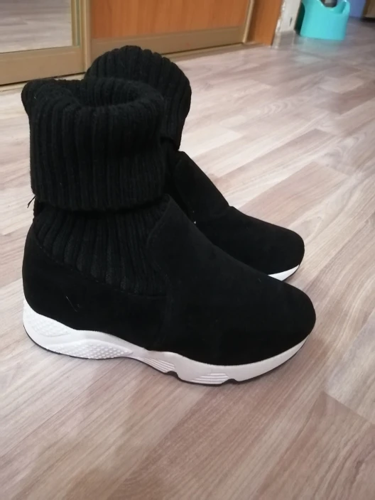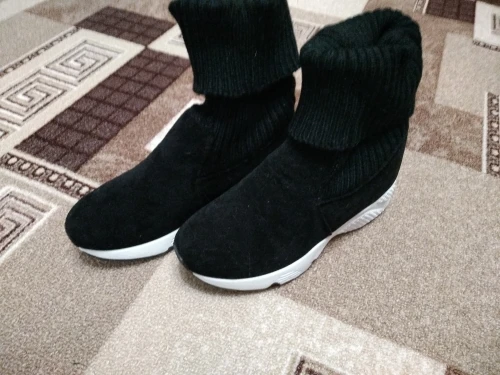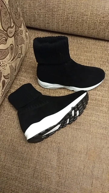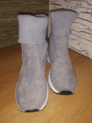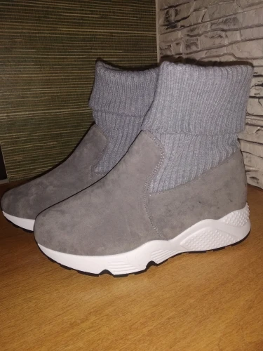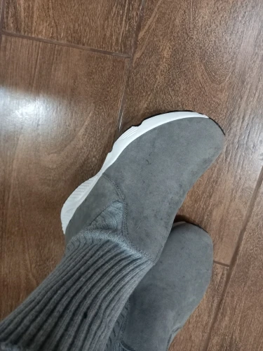 Доставка примерно 3 недели. Я ориентировалась на сетку продавца и на стопу 235мм заказала размер 7 (маркировка 38) - подошло, еще и носочек влезет. Обувь выполнена из искусственной замши. Та довольно жесткая и плотная. Сверху вязанный чулок, который можно завернуть или носить в расправленном виде. Внутри пушистый искусственный мех, длиною около см. Подошва белая, спортивного плана. Достаточно высокая, удобная. Стелька съемная. Качество хорошее. Немного есть следы клея. В остальном всё отлично.