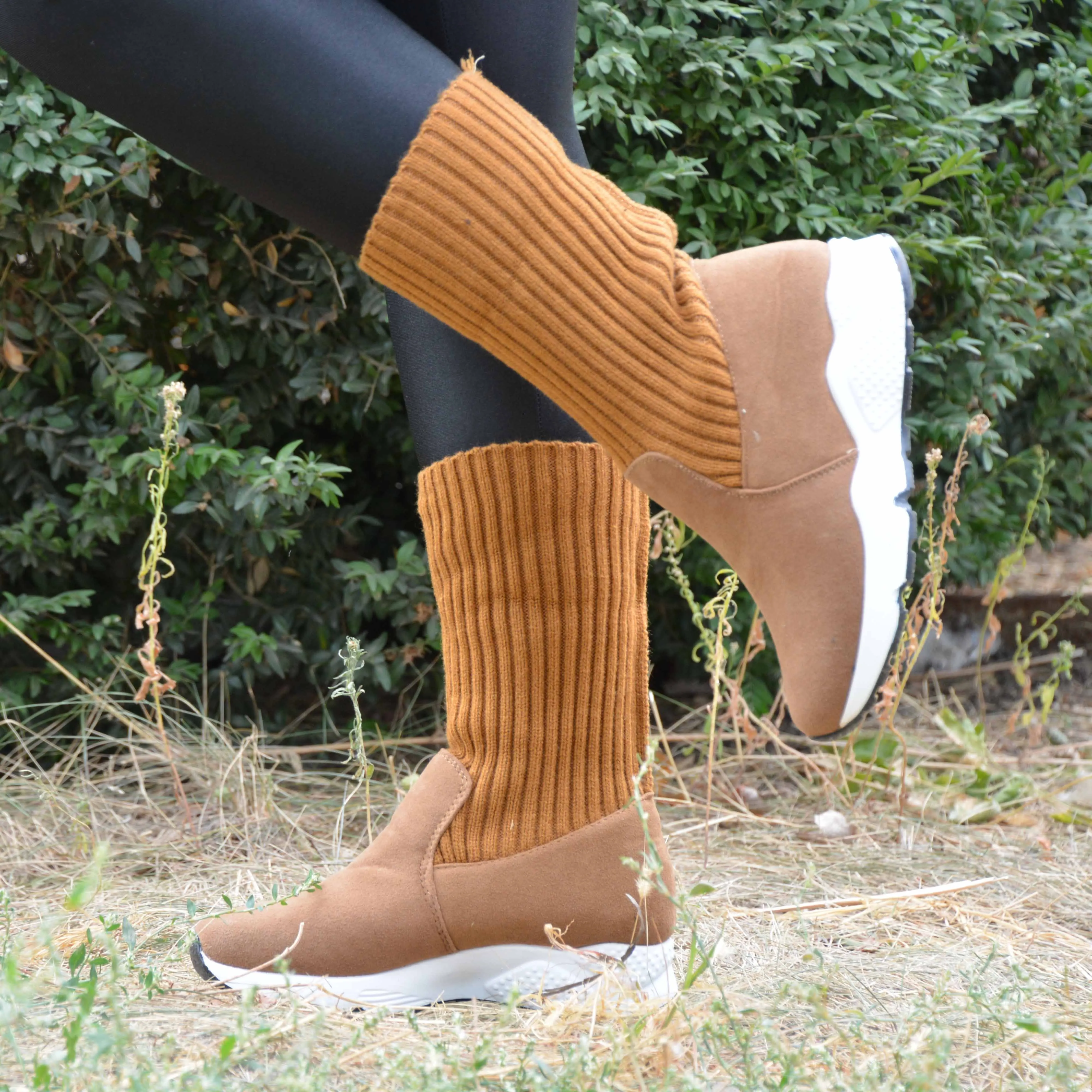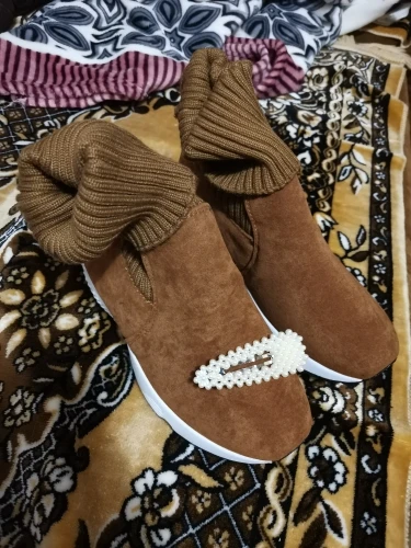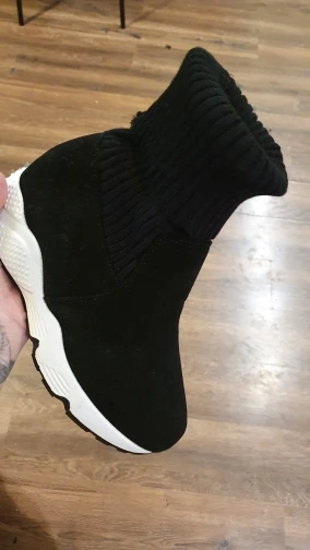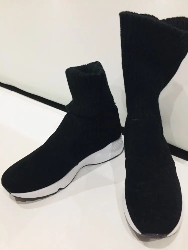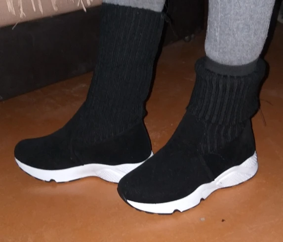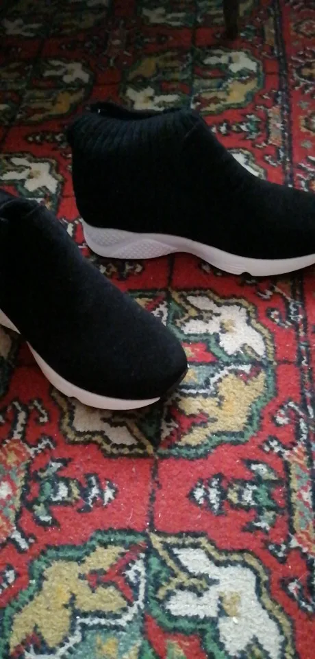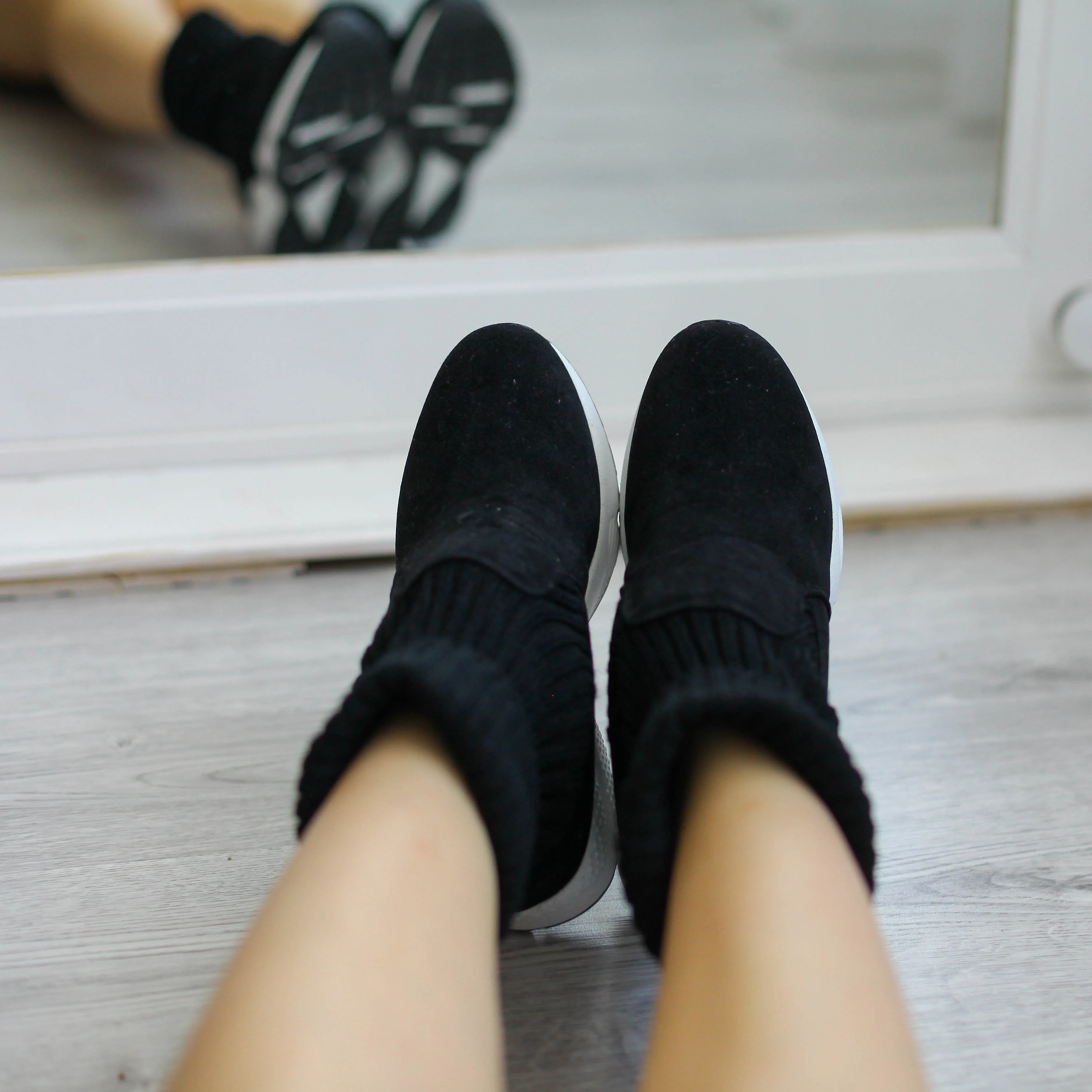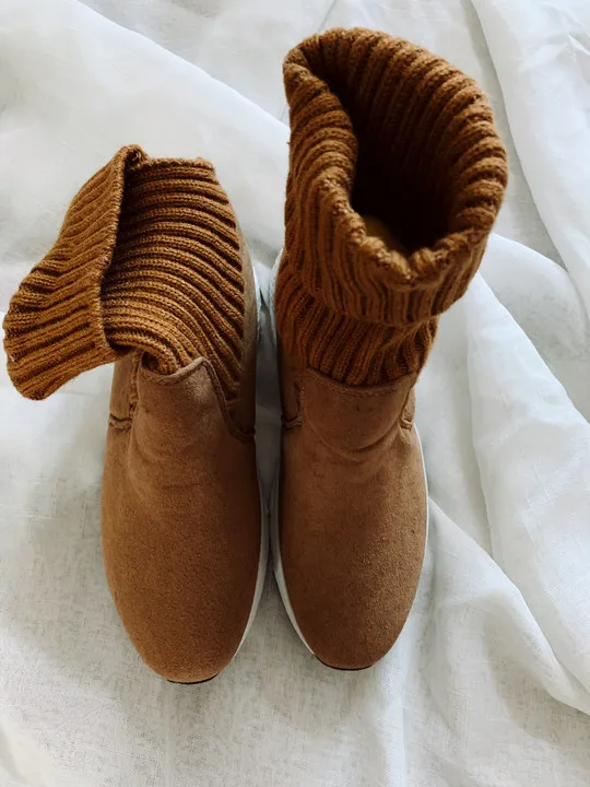 Доставка примерно 3 недели. Я ориентировалась на сетку продавца и на стопу 235мм заказала размер 7 (маркировка 38) - подошло, еще и носочек влезет. Обувь выполнена из искусственной замши. Та довольно жесткая и плотная. Сверху вязанный чулок, который можно завернуть или носить в расправленном виде. Внутри пушистый искусственный мех, длиною около см. Подошва белая, спортивного плана. Достаточно высокая, удобная. Стелька съемная. Качество хорошее. Немного есть следы клея. В остальном всё отлично.