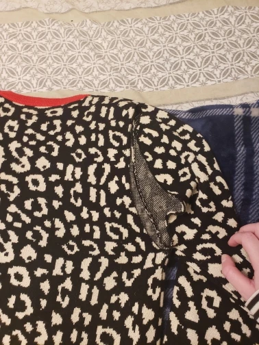 свитер очень красивый, стильный, сшит качественно, нитки нигде не торчат. ткань синтетика, но на ощупь очень приятная, довольно плотная. на мой xs сел отлично, слегка оверсайз, но по плечам прям как раз.