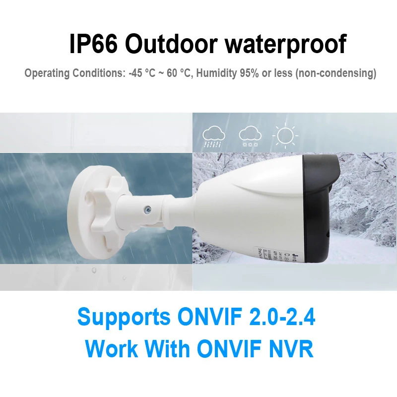 Поддержка ONVIF, может работать со вечерние видеорегистратором Поддержка POE (опционально) Поддержка уличной водонепроницаемости Разрешение: 1944P(2592*1944) Объектив: Объектив 3,6 мм (6 мм, 3,6 мм на выбор) Поддержка мобильного видеонаблюдения (iOS,android) Поддержка обнаружения движения и оповещения по электронной почте Поддержка ночного видения С IR-CUT, поддержка переключателя день/ночь 36 ИК-светодиодов, 15-30 м ИК-расстояние для ночного видения Многоэкранное программное обеспечение и CMS Обработка изображений: Автоматическая экспозиция (AE), автоматический баланс белого (AWB), автоматический контроль усиления (AGC) Поддержка обнаружения движения