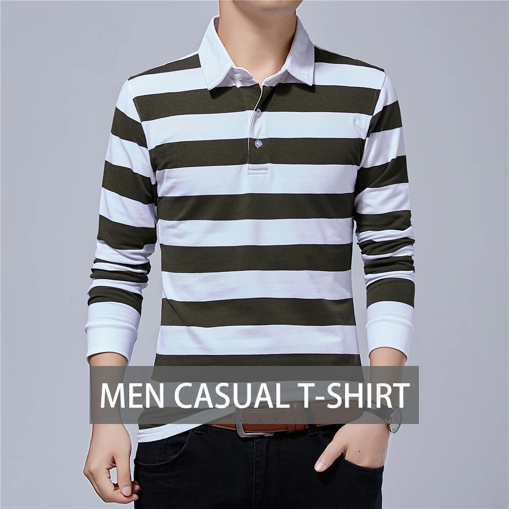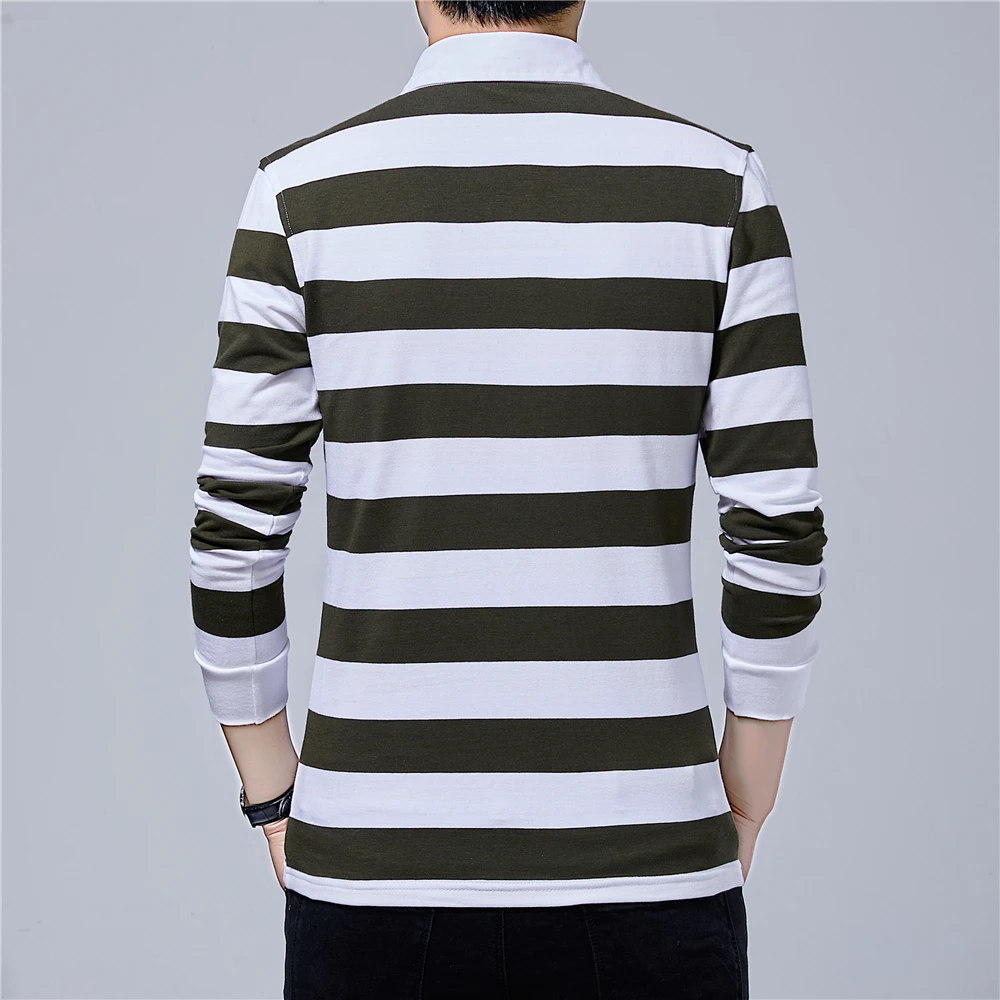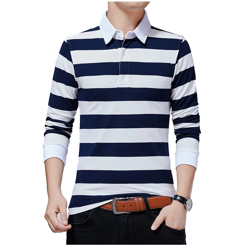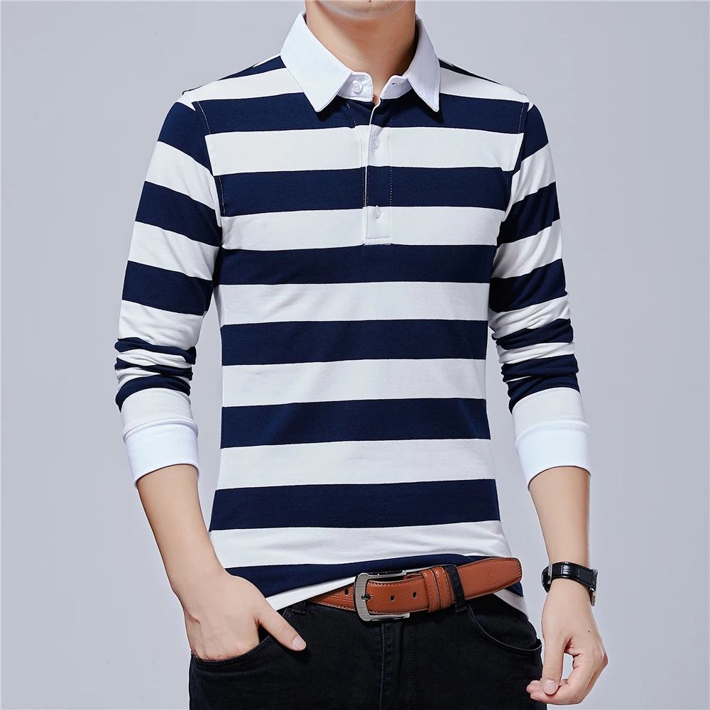 Мужская хлопковая футболка в полоску, с отложным воротником и длинным рукавом