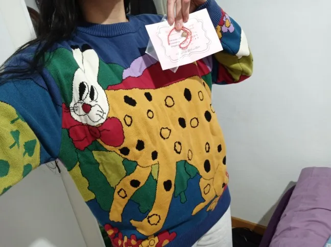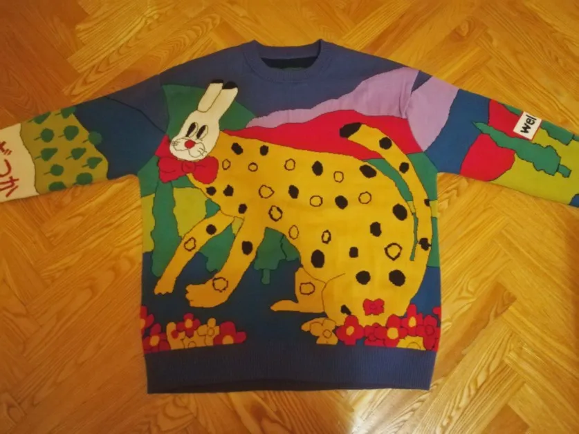 Очень довольна покупкой! Дизайн шикарнейший! Картинка полностью соответствует фото продавца. На рост 169 рукава чуть-чуть длинноваты, но не критично, вообще на ОГ 92 лёгкий оверсайз. Подойдет явно и на больший рост, и на большие объёмы, думаю, на 50-й российский размер сядет нормально. По структуре- не пушистый совсем, гладкий. Не колючий. Не рыхлый, довольно плотный и не тонкий. Доставка мега быстрая. Красота неописуемая! Спасибо продавцу и китайским производителям! В этом магазине ещё много чего интересного; вещи, может, не самые дешёвые на Али, но очень оригинальные. Обязательно сюда вернусь. Кому нравится яркое и необычное,- не проходите мимо!
