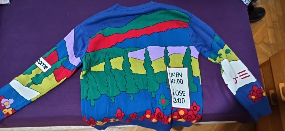 Очень понравился! Как уже писали ранее, цвета чуть менее насыщенные, чем на фотографиях продавца. Но мне так даже больше нравится. Свитер толстый, вязка не рыхлая, а очень плотная. И это не может не радовать! Думаю, что этот оверсайз только для девушек невысокого роста. Высоким будет просто обычный свитер. Я долго искала что-то подобное, психоделическое что-ли и нашла Очень довольна! Осталось попробовать как будет в носке. Доставка до Лондона заняла двадцать дней.