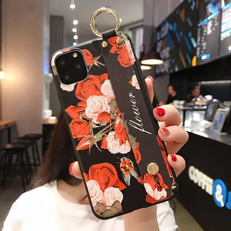 Чехол для Iphone 11 Pro Max, мягкий чехол из ТПУ с ремешком на запястье для Iphone X XR XS Max 6 6S 7 8 Plus, чехол-подставка с розовым цветком