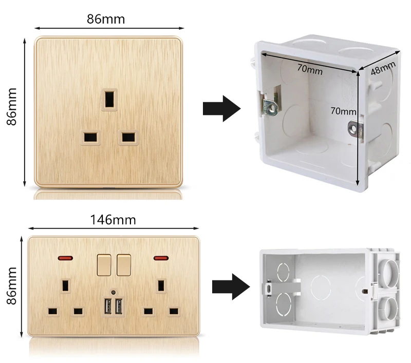 Спецификация: Тип: настенная розетка Материал панели: панель из алюминиевого сплава Цвет: золото Номинальный ток: 13 а Номинальное напряжение: 110-250 В Размер переключателя (Д * Ш): 86 мм * 86 мм Упаковочный лист: 1x розетка 2x винт Примечание: переключатель на розетке представляет собой источник питания для розетки управления.
